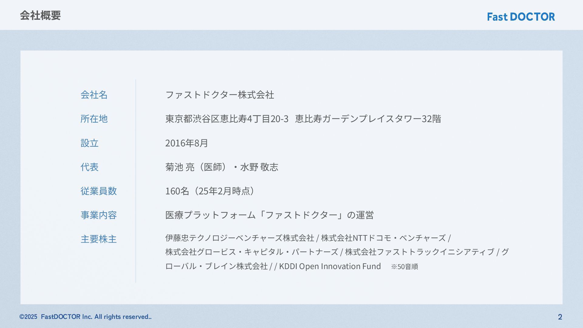 ©2025 FastDOCTOR Inc. All rights reserved.. ファストドクター株式会社 東京都渋⾕区恵⽐寿4丁⽬20-3 恵⽐寿ガーデンプレイスタワー32階 2016年8⽉