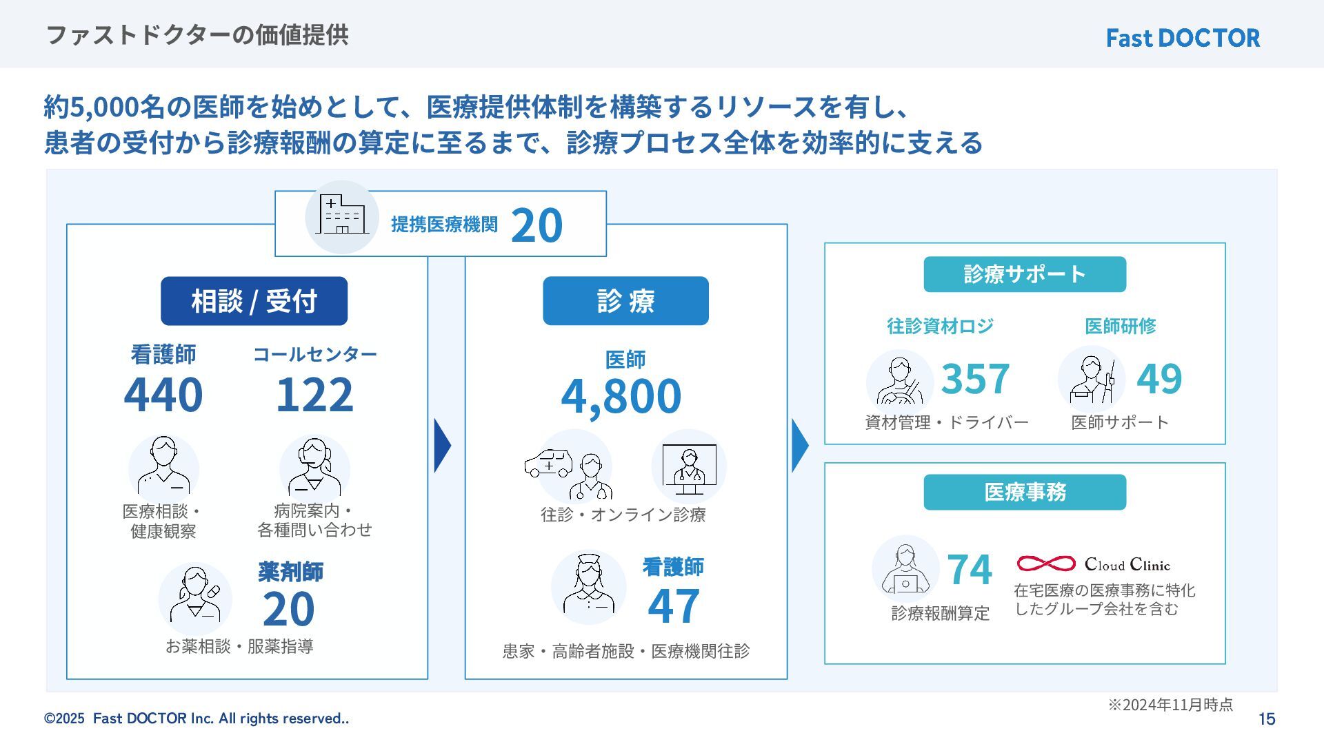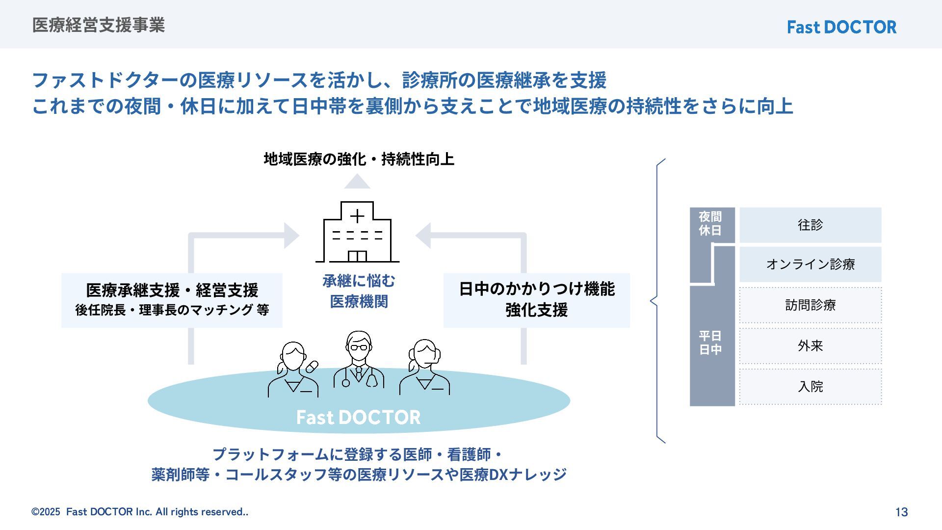 ©2025 Fast DOCTOR Inc. All rights reserved.. 医療経営⽀援事業 プラットフォームに登録する医師‧看護師‧ 薬剤師等‧コールスタッフ等の医療リソースや医療DXナレッジ