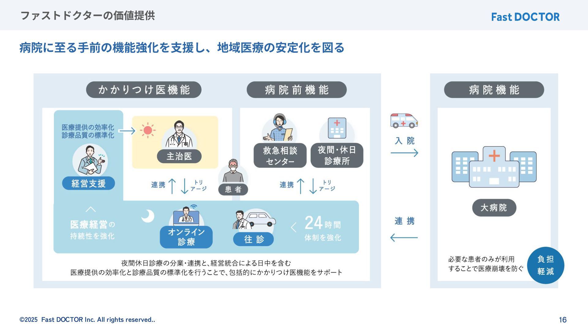 ©2025 Fast DOCTOR Inc. All rights reserved.. 16 ファストドクターの価値提供 病院に⾄る⼿前の機能強化を⽀援し、地域医療の安定化を図る