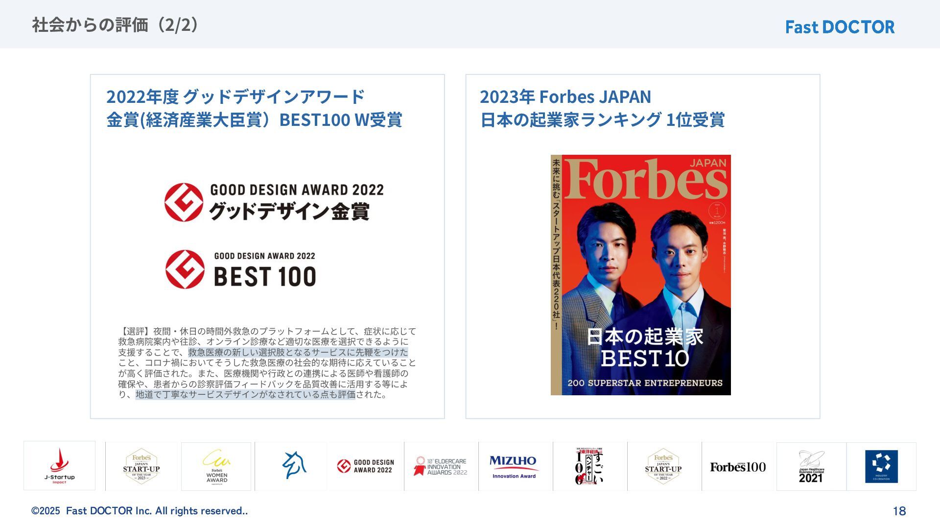 ©2025 Fast DOCTOR Inc. All rights reserved.. 17 社会からの評価(1/2) 2025年