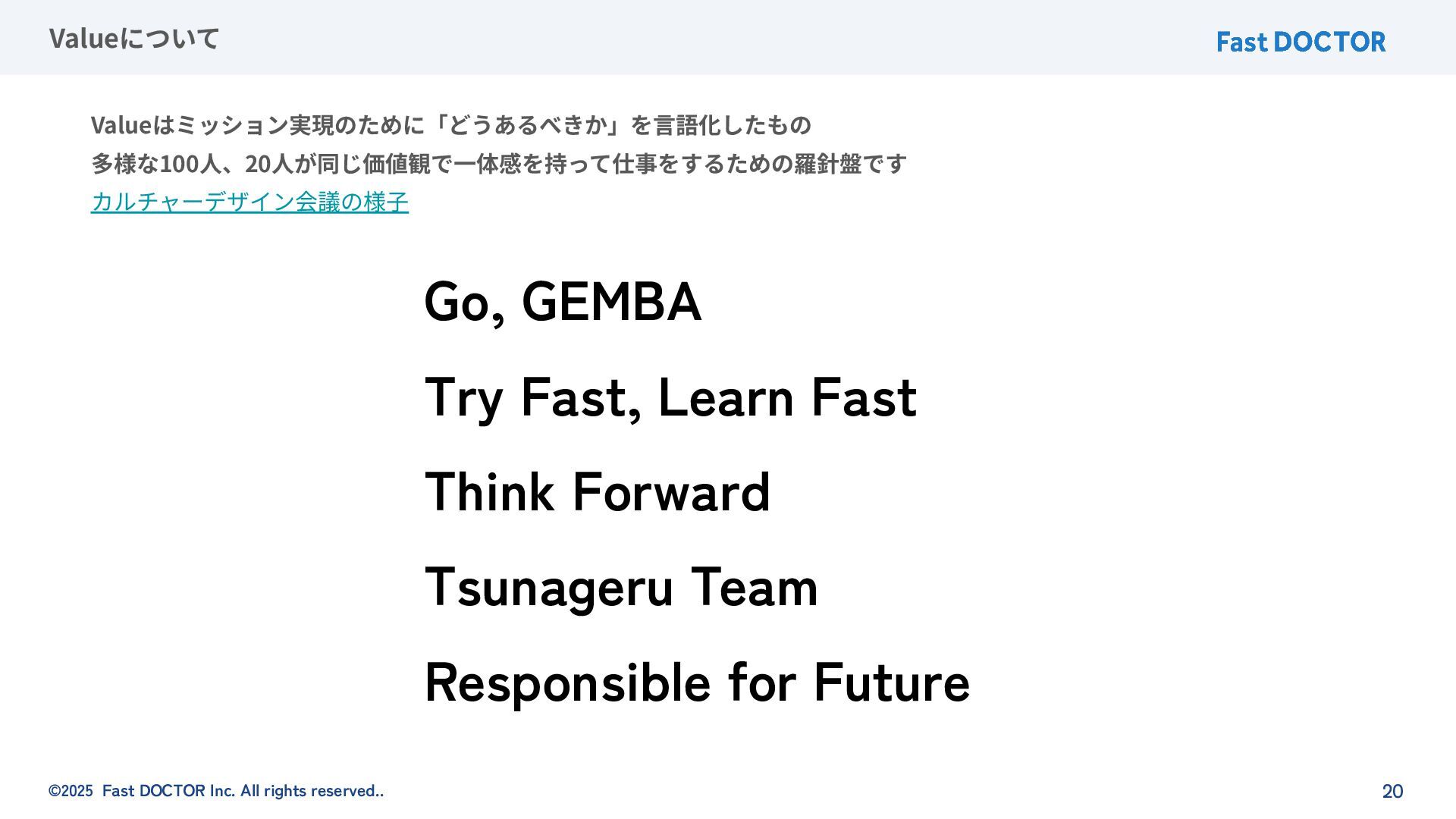 ©2025 Fast DOCTOR Inc. All rights reserved.. 20 Valueについて Valueはミッション実現のために「どうあるべきか」を⾔語化したもの