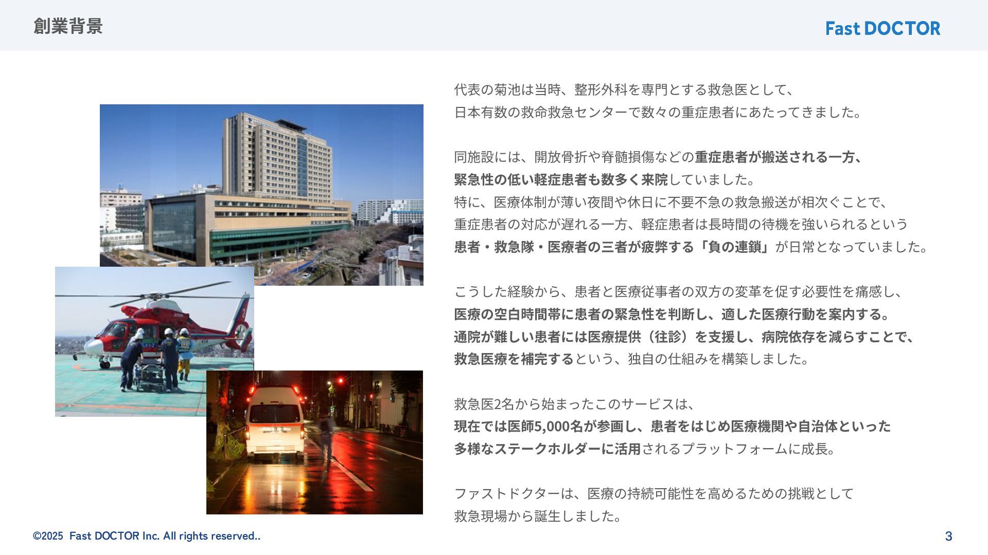 ©2025 Fast DOCTOR Inc. All rights reserved.. 3 創業背景 代表の菊池は当時、整形外科を専⾨とする救急医として、