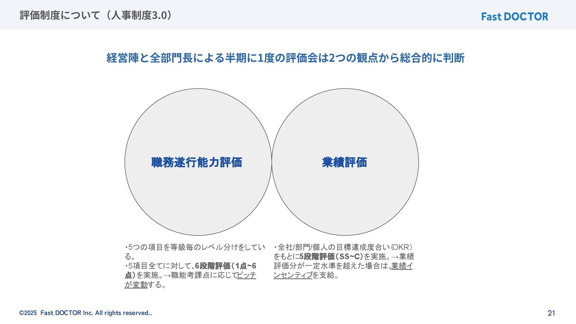 ©2025 Fast DOCTOR Inc. All rights reserved.. 21 評価制度について(⼈事制度3.0) 経営陣と全部⾨⻑による半期に1度の評価会は2つの観点から総合的に判断