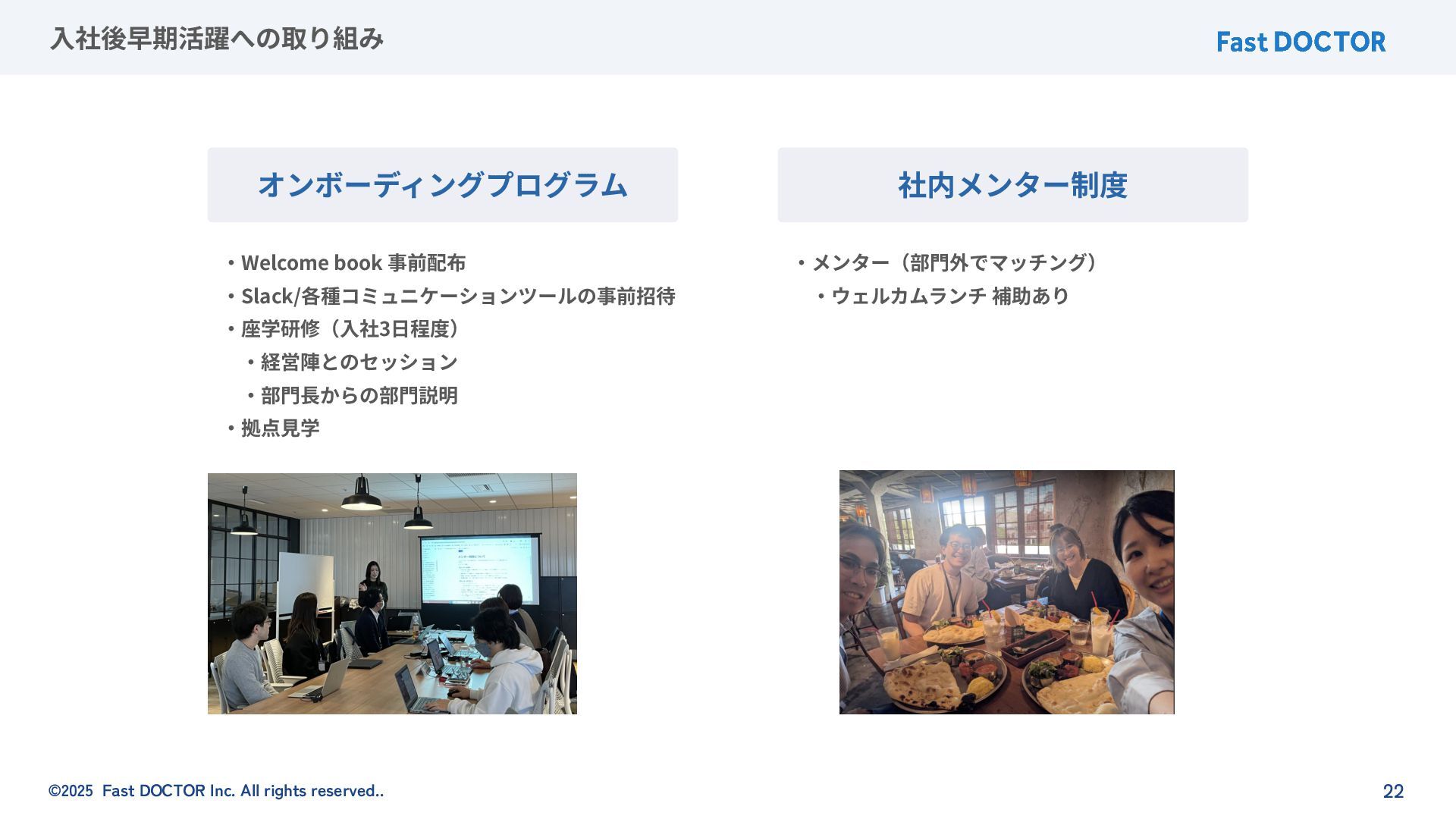 ©2025 Fast DOCTOR Inc. All rights reserved.. 22 ⼊社後早期活躍への取り組み ‧Welcome