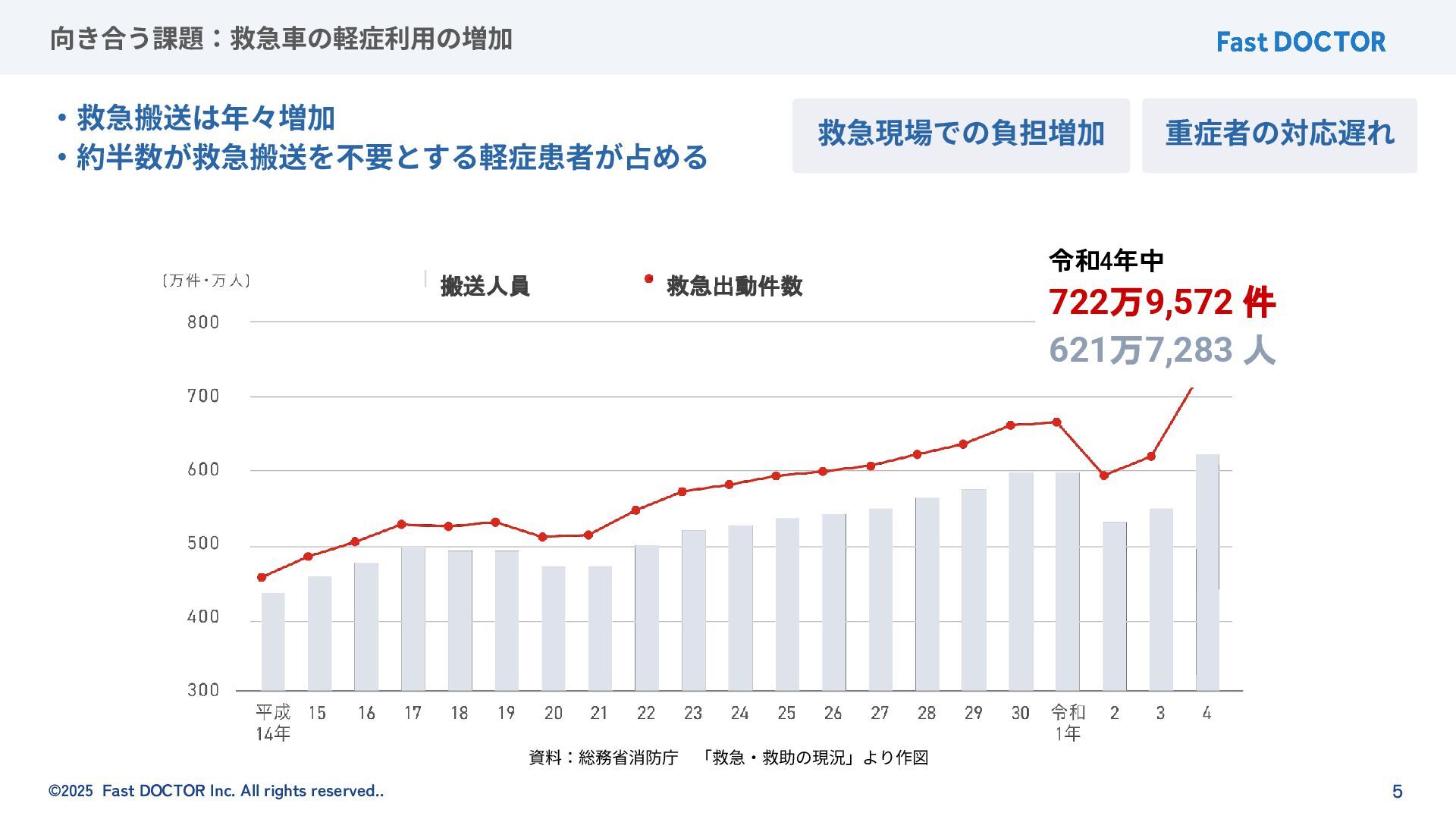 ©2025 Fast DOCTOR Inc. All rights reserved.. 5 向き合う課題:救急⾞の軽症利⽤の増加 ‧救急搬送は年々増加