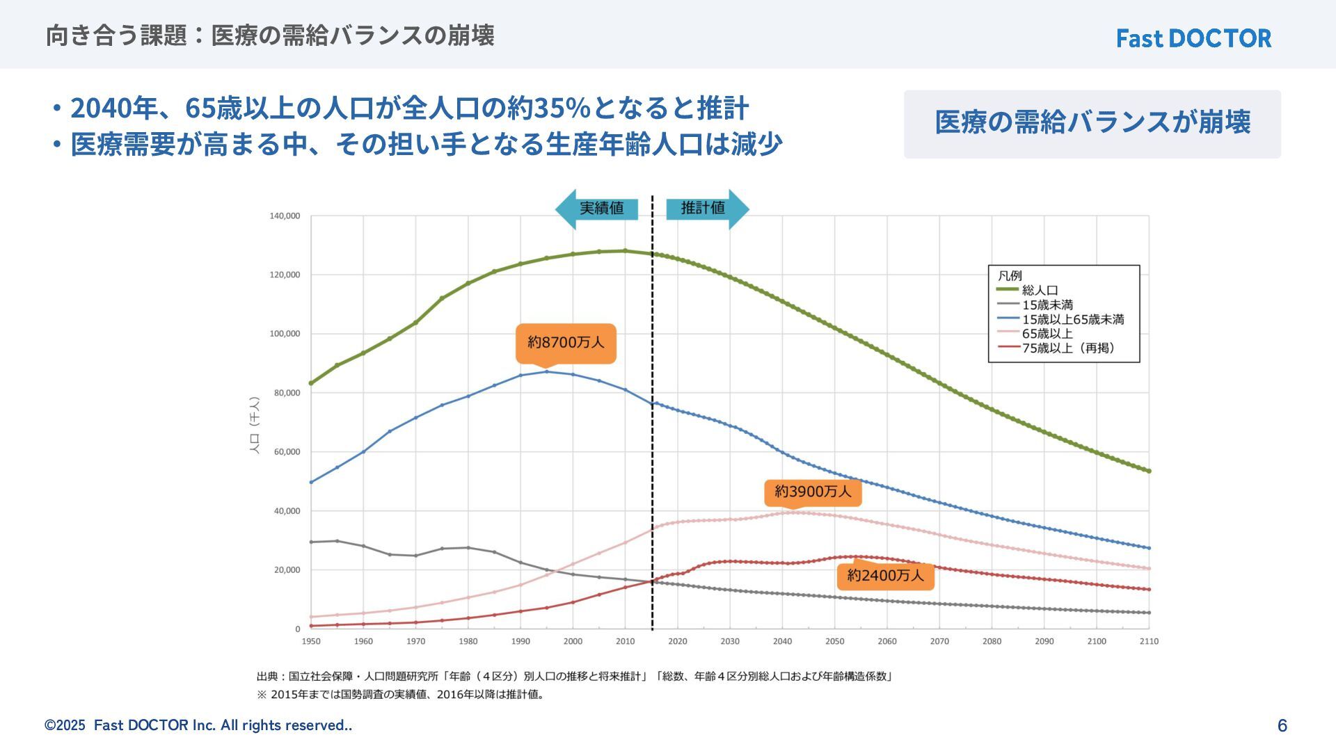 ©2025 Fast DOCTOR Inc. All rights reserved.. 6 向き合う課題:医療の需給バランスの崩壊 ‧2040年、65歳以上の⼈⼝が全⼈⼝の約35%となると推計