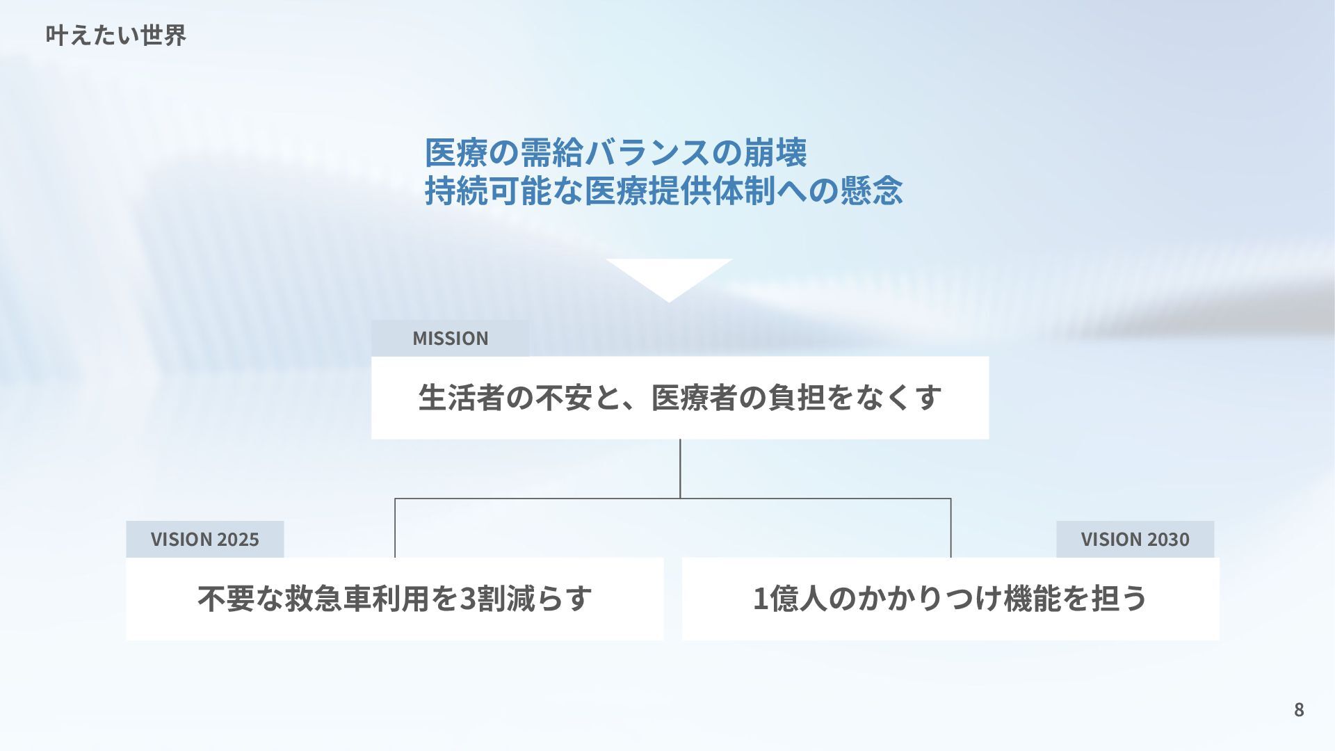 8 ⽣活者の不安と、医療者の負担をなくす 不要な救急⾞利⽤を3割減らす 1億⼈のかかりつけ機能を担う MISSION VISION 2025 VISION 2030 叶えたい世界