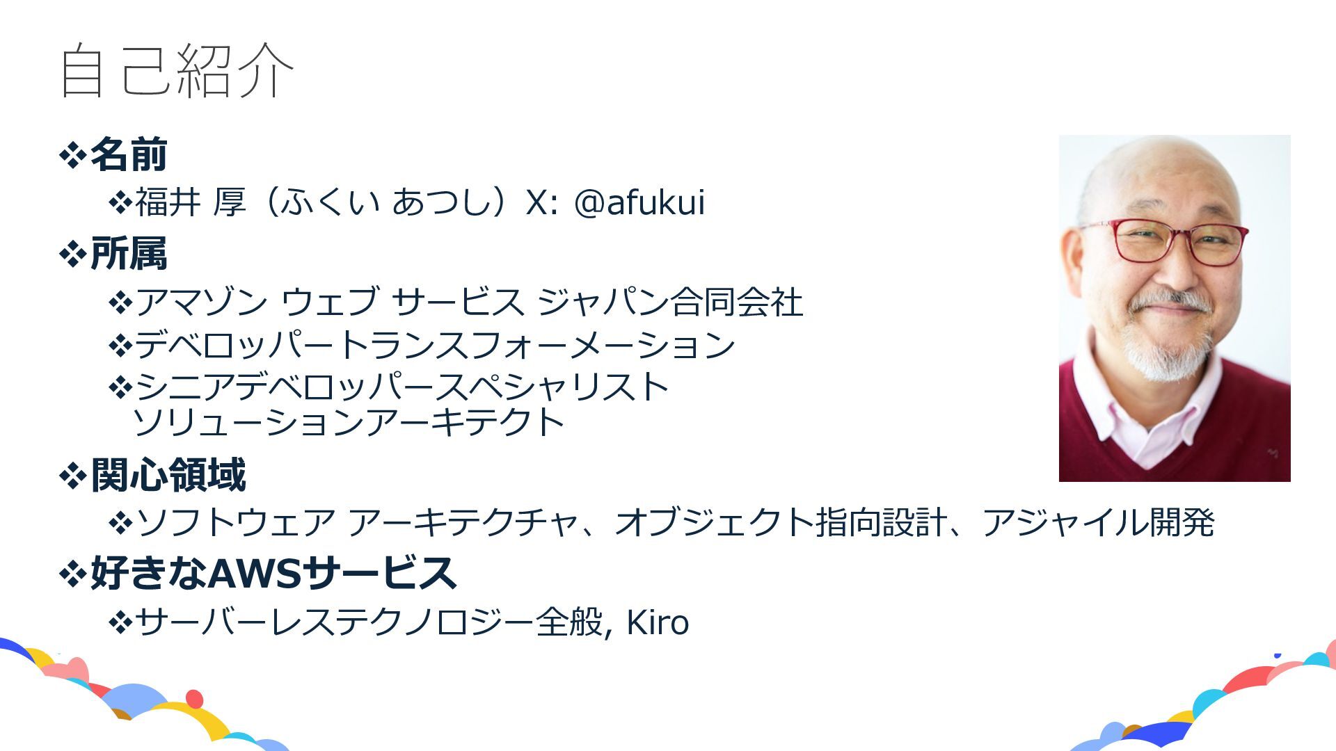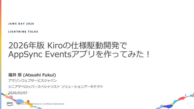 rights reserved. L I G H T N I N G T A L K S 2026年版 Kiroの仕様駆動開発で AppSync Eventsアプリを作ってみた︕ 福井 厚 (Atsushi Fukui) J A W S D A Y 2 0 2 6 アマゾンウェブサービスジャパン シニアデベロッパースペシャリスト ソリューションアーキテクト 2026/03/07 1