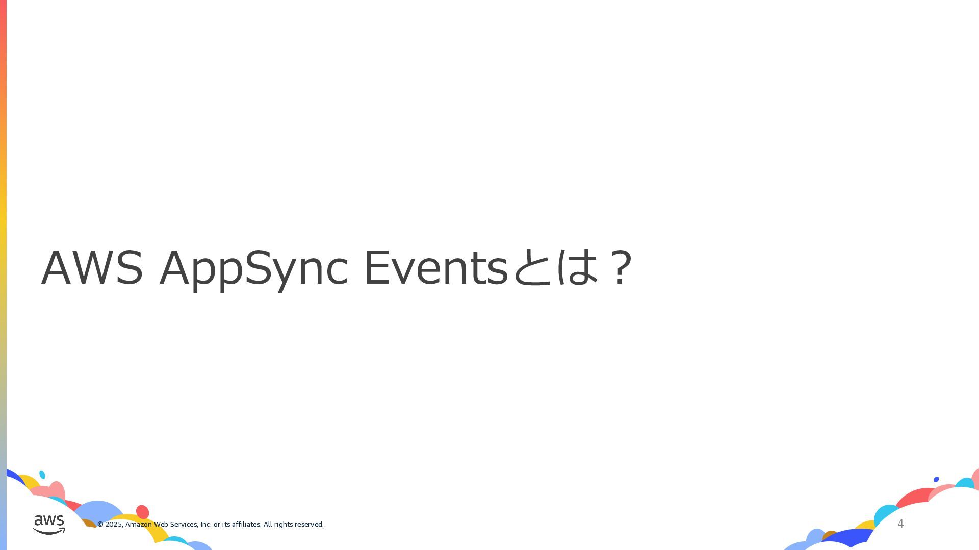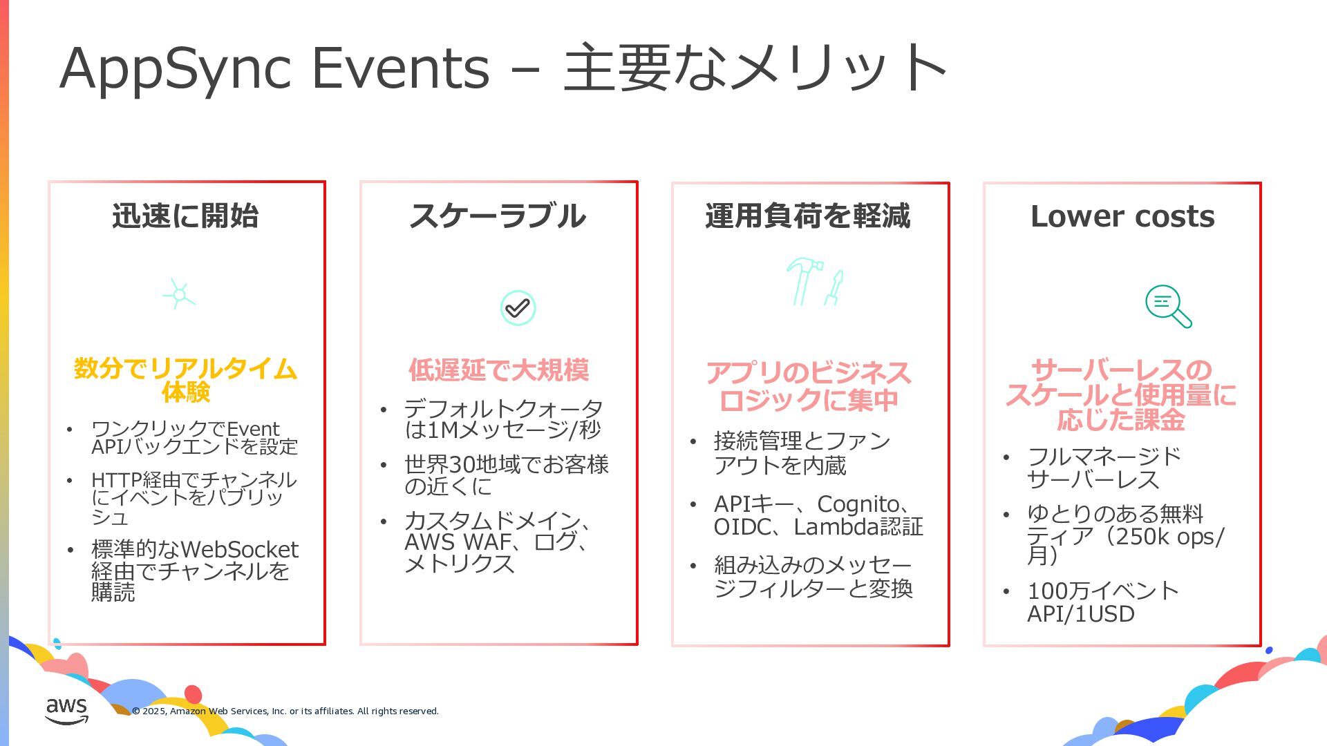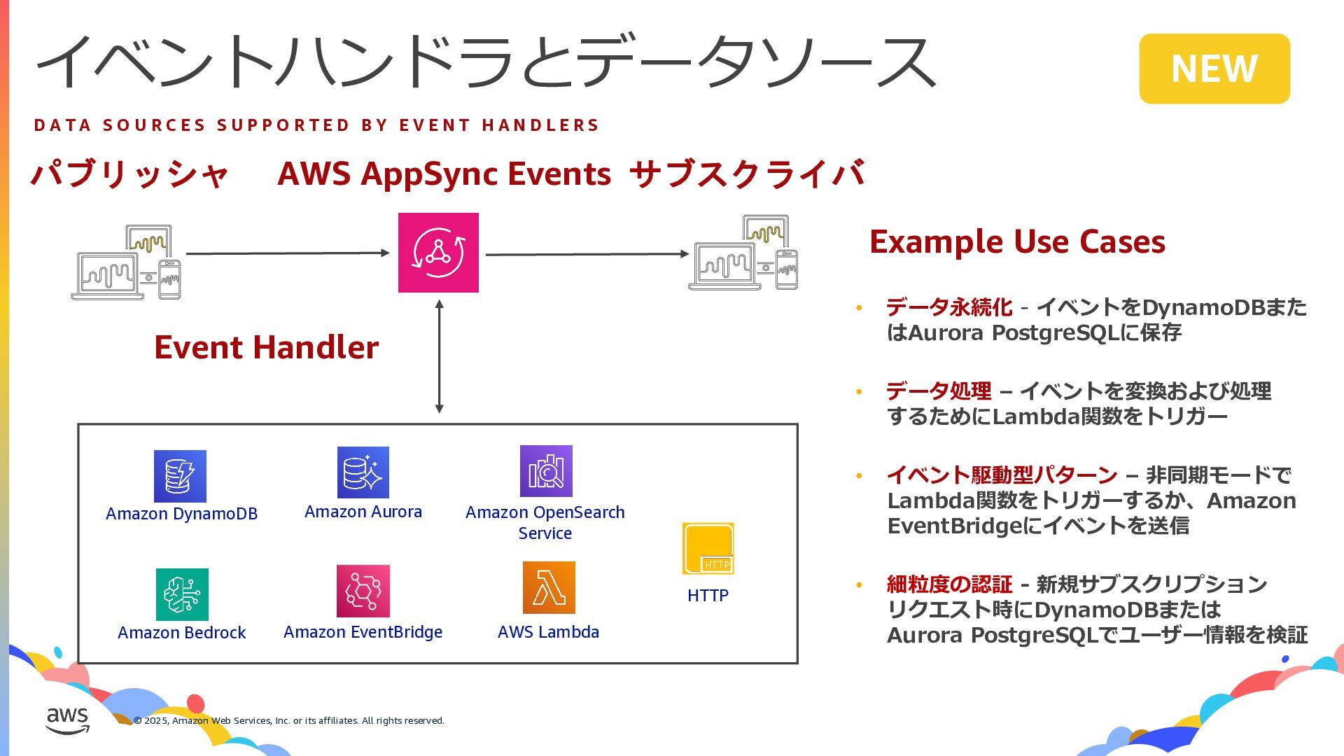 rights reserved. イベントハンドラとデータソース Amazon DynamoDB Amazon Aurora Amazon OpenSearch Service AWS Lambda HTTP Amazon EventBridge Amazon Bedrock AWS AppSync Events パブリッシャ サブスクライバ Event Handler • データ永続化 - イベントをDynamoDBまた はAurora PostgreSQLに保存 • データ処理 – イベントを変換および処理 するためにLambda関数をトリガー • イベント駆動型パターン – ⾮同期モードで Lambda関数をトリガーするか、Amazon EventBridgeにイベントを送信 • 細粒度の認証 - 新規サブスクリプション リクエスト時にDynamoDBまたは Aurora PostgreSQLでユーザー情報を検証 Example Use Cases NEW D A T A S O U R C E S S U P P O R T E D B Y E V E N T H A N D L E R S