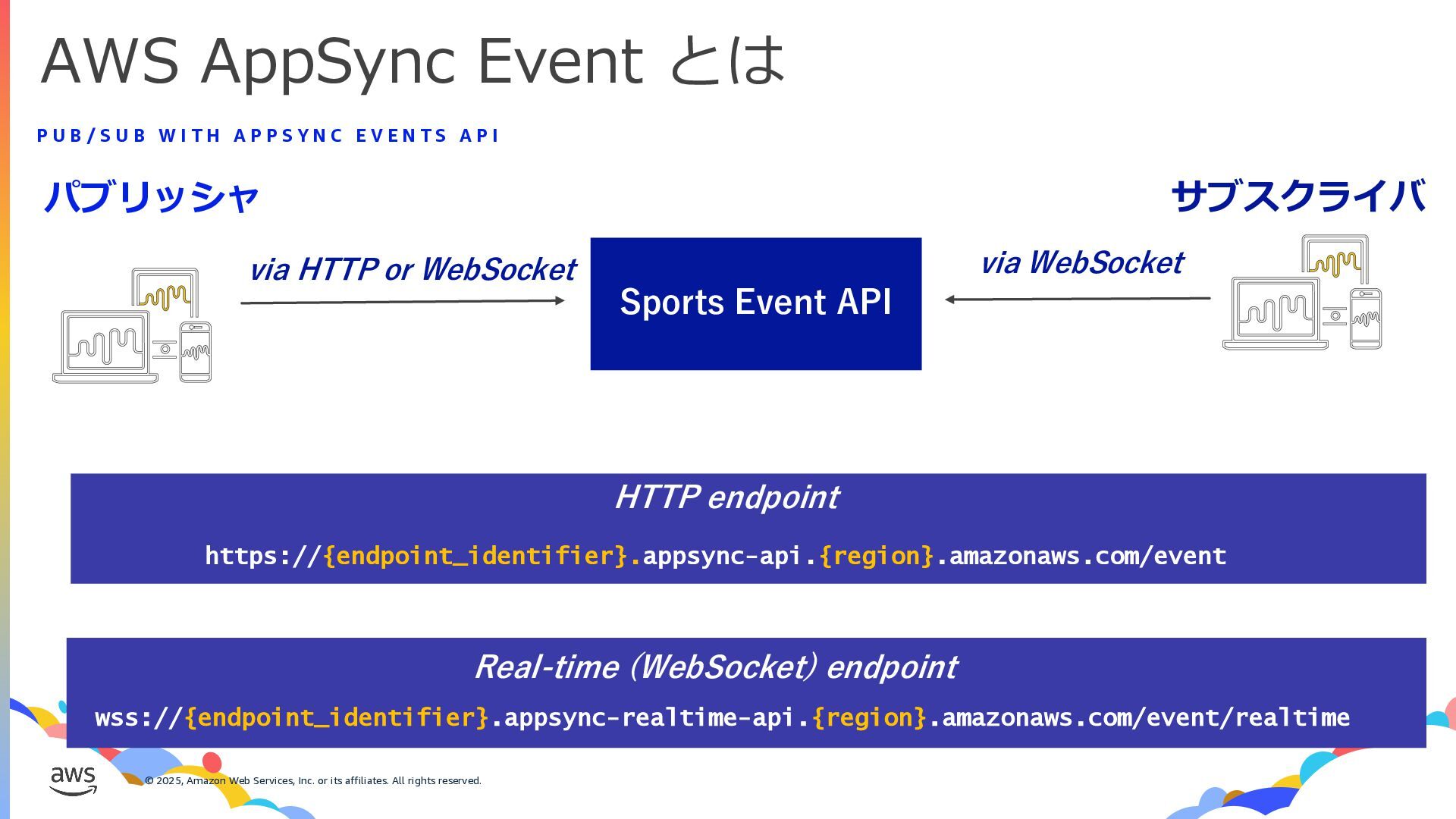 rights reserved. P U B / S U B W I T H A P P S Y N C E V E N T S A P I Sports Event API HTTP endpoint Real-time (WebSocket) endpoint https://{endpoint_identifier}.appsync-api.{region}.amazonaws.com/event wss://{endpoint_identifier}.appsync-realtime-api.{region}.amazonaws.com/event/realtime パブリッシャ via HTTP or WebSocket サブスクライバ via WebSocket AWS AppSync Event とは