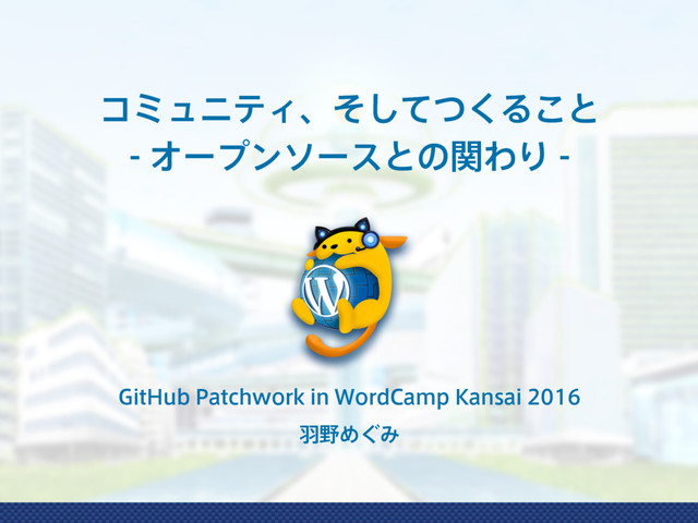 GitHub Patchwork in WordCamp Kansai 2016 の登壇資料です。 OSS である WordPress とそのコミュニティとの関わりを軸に、オープンソースでの体験をスピーチしました。オープンソースはコードが書ける人やプログラミングができる人だけのものではなく、みんなのためのものであること。そして、できることから初めてみよう、ということをお話させていただきました。
