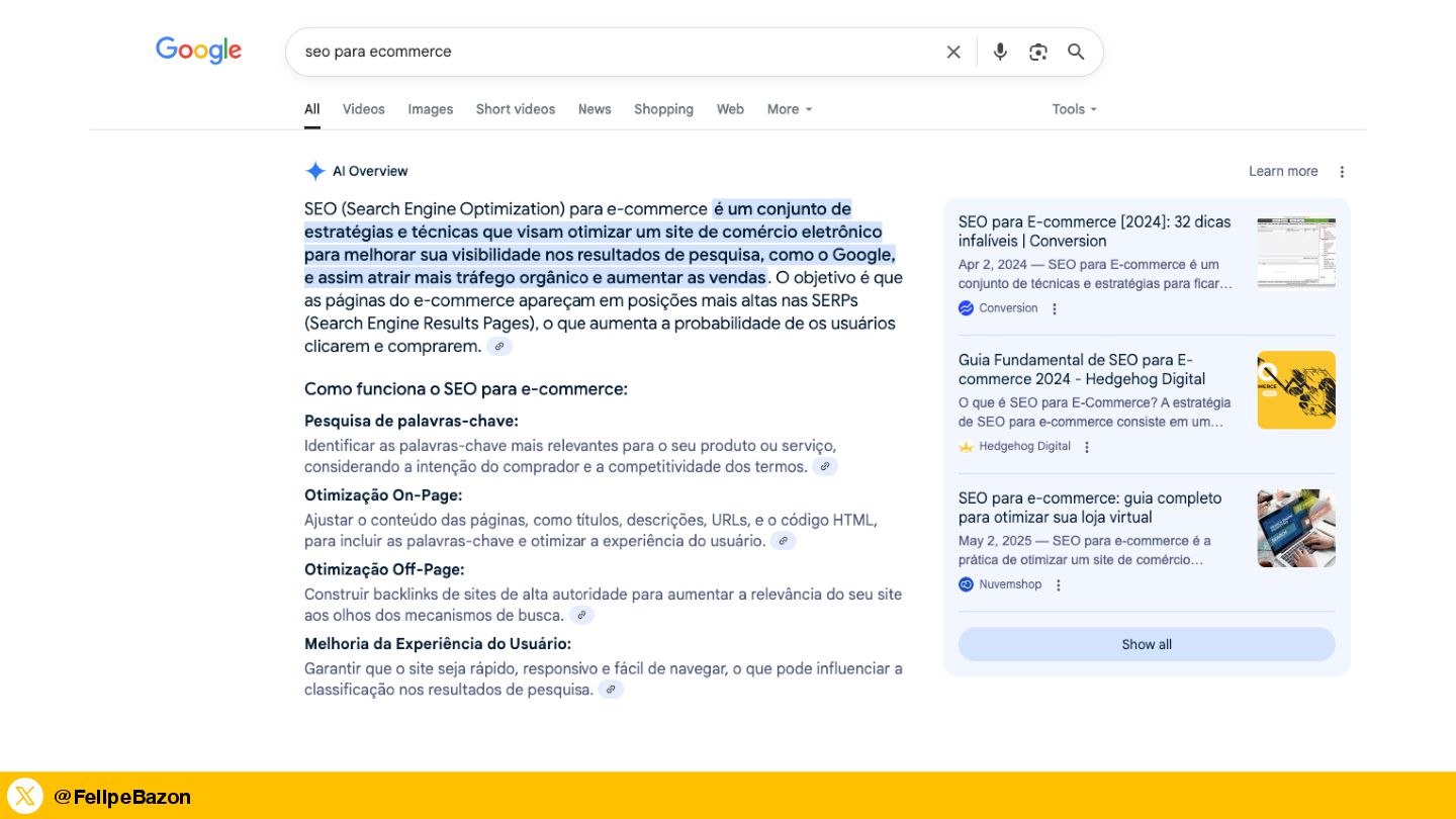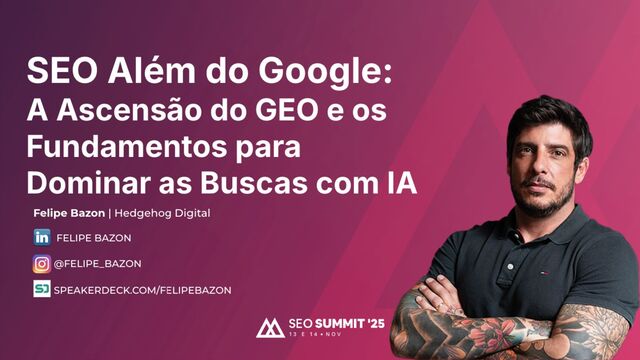 Descrição curta: Com a chegada dos AI Overviews, do Google AI Mode e de novos mecanismos de busca baseados em IA como ChatGPT, Perplexity e Gemini, a busca orgânica vive uma transformação profunda. Nesta palestra, Felipe Bazon apresenta os fundamentos do GEO (Entity Optimization, Topical Authority e Information Gain) e mostra como dominar ecossistemas de busca tradicionais e generativos para ampliar visibilidade e relevância de marca.