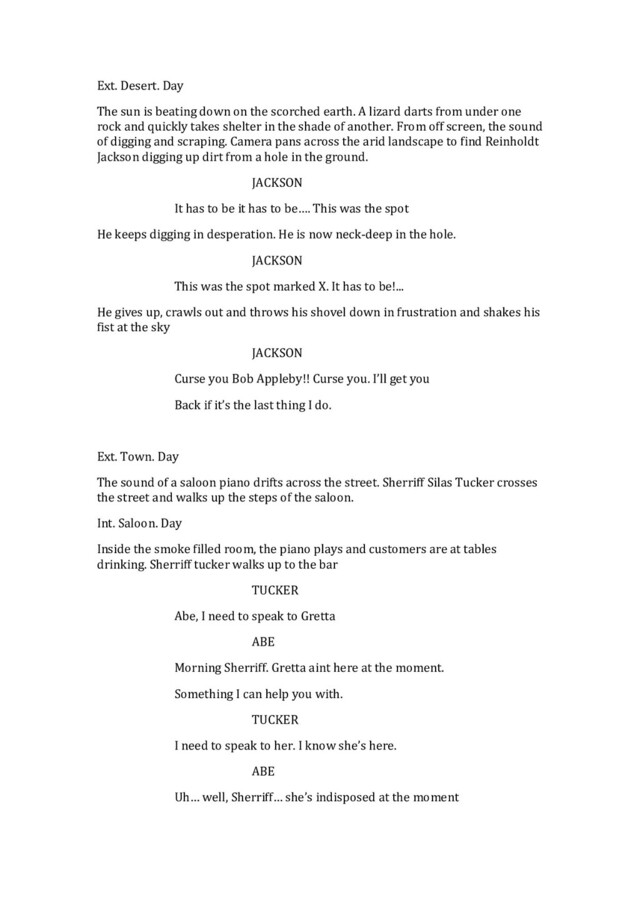 scorched earth. A lizard darts from under one rock and quickly takes shelter in the shade of another. From off screen, the sound of digging and scraping. Camera pans across the arid landscape to find Reinholdt Jackson digging up dirt from a hole in the ground. JACKSON It has to be it has to be…. This was the spot He keeps digging in desperation. He is now neck-deep in the hole. JACKSON This was the spot marked X. It has to be!... He gives up, crawls out and throws his shovel down in frustration and shakes his fist at the sky JACKSON Curse you Bob Appleby!! Curse you. I’ll get you Back if it’s the last thing I do. Ext. Town. Day The sound of a saloon piano drifts across the street. Sherriff Silas Tucker crosses the street and walks up the steps of the saloon. Int. Saloon. Day Inside the smoke filled room, the piano plays and customers are at tables drinking. Sherriff tucker walks up to the bar TUCKER Abe, I need to speak to Gretta ABE Morning Sherriff. Gretta aint here at the moment. Something I can help you with. TUCKER I need to speak to her. I know she’s here. ABE Uh… well, Sherriff… she’s indisposed at the moment