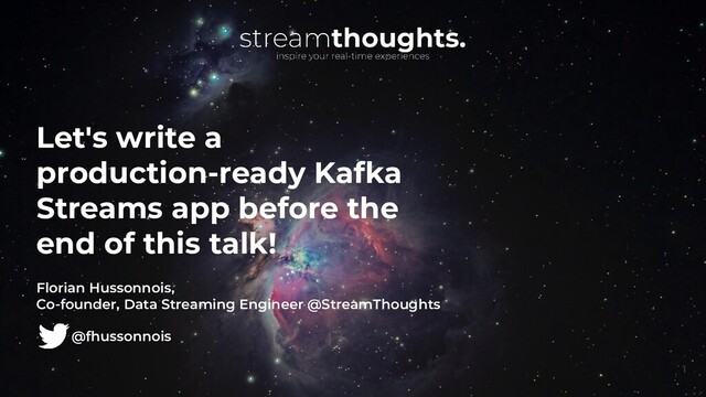 In this talk, I propose to show you how to easily build a Kafka Streams application for production in just a few minutes. But before that,