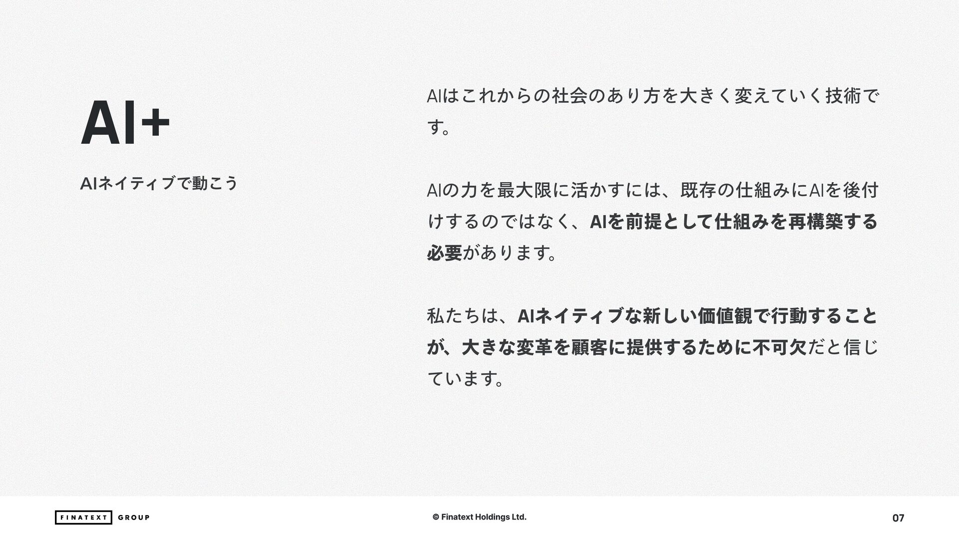 AIネイティブで動こう AI+ AIはこれからの社会のあり方を大きく変えていく技術で す。 AIの力を最大限に活かすには、既存の仕組みにAIを後付 けするのではなく、AIを前提として仕組みを再構築する 必要があります。 私たちは、AIネイティブな新しい価値観で行動すること が、大きな変革を顧客に提供するために不可欠だと信じ ています。