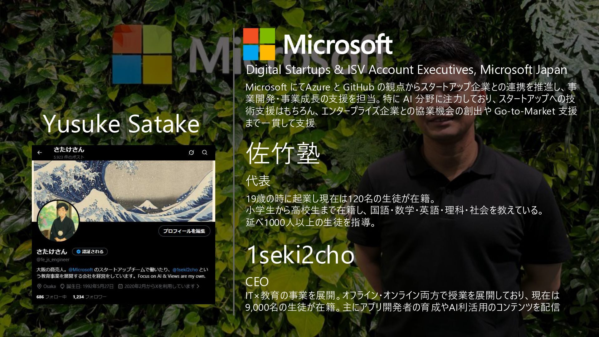 Microsoft にてAzure と GitHub の観点からスタートアップ企業との連携を推進し、事 業開発・事業成長の支援を担当。特に AI 分野に注力しており、スタートアップへの技 術支援はもちろん、エンタープライズ企業との協業機会の創出や Go-to-Market 支援 まで一貫して支援 代表 19歳の時に起業し現在は120名の生徒が在籍。 小学生から高校生まで在籍し、国語・数学・英語・理科・社会を教えている。 延べ1000人以上の生徒を指導。 佐竹塾 CEO IT×教育の事業を展開。オフライン・オンライン両方で授業を展開しており、現在は 9,000名の生徒が在籍。主にアプリ開発者の育成やAI利活用のコンテンツを配信 1seki2cho
