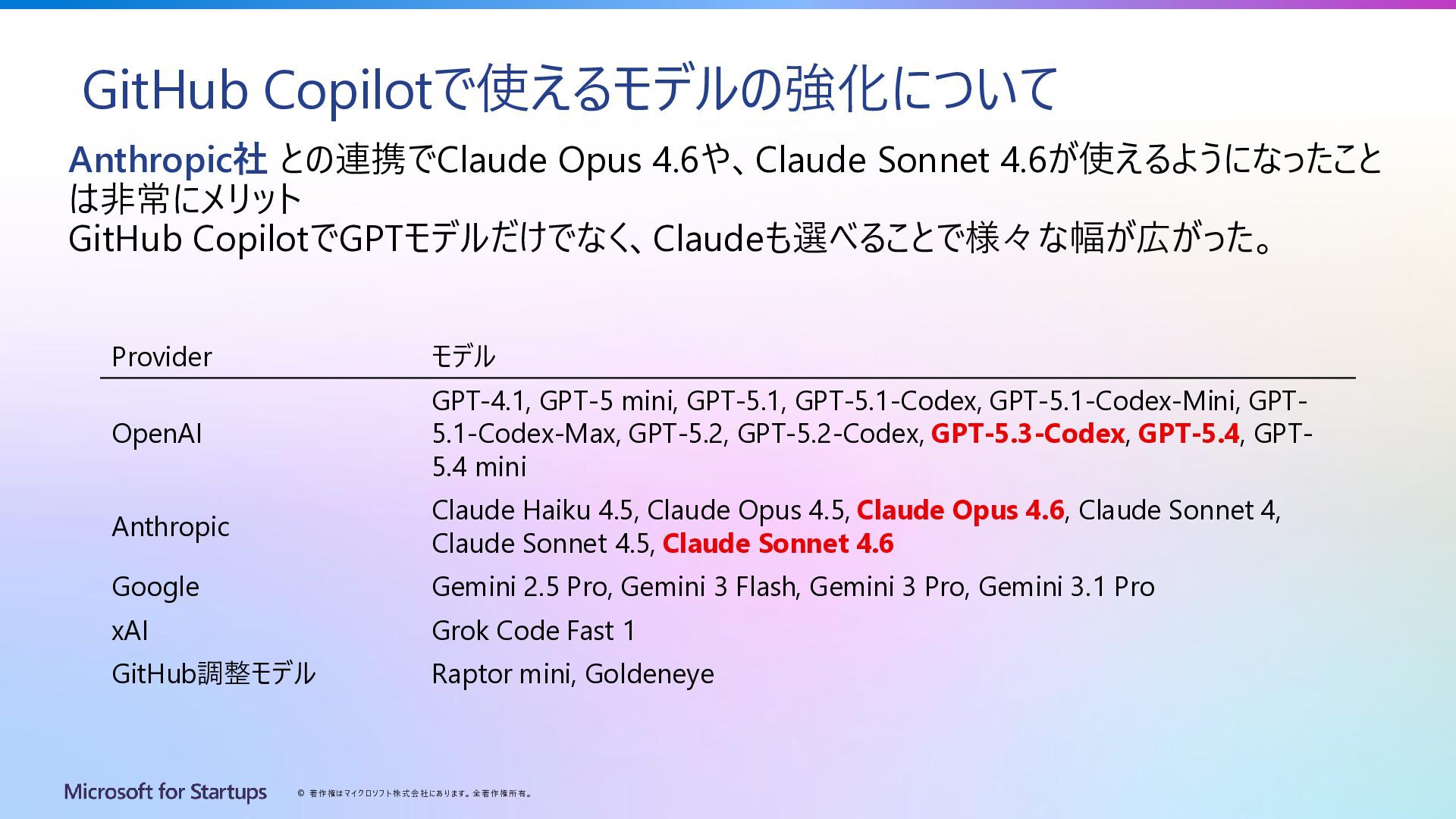 Copilotで使えるモデルの強化について Anthropic社 との連携でClaude Opus 4.6や、Claude Sonnet 4.6が使えるようになったこと は非常にメリット GitHub CopilotでGPTモデルだけでなく、Claudeも選べることで様々な幅が広がった。 Provider モデル OpenAI GPT-4.1, GPT-5 mini, GPT-5.1, GPT-5.1-Codex, GPT-5.1-Codex-Mini, GPT- 5.1-Codex-Max, GPT-5.2, GPT-5.2-Codex, GPT-5.3-Codex, GPT-5.4, GPT- 5.4 mini Anthropic Claude Haiku 4.5, Claude Opus 4.5, Claude Opus 4.6, Claude Sonnet 4, Claude Sonnet 4.5, Claude Sonnet 4.6 Google Gemini 2.5 Pro, Gemini 3 Flash, Gemini 3 Pro, Gemini 3.1 Pro xAI Grok Code Fast 1 GitHub調整モデル Raptor mini, Goldeneye