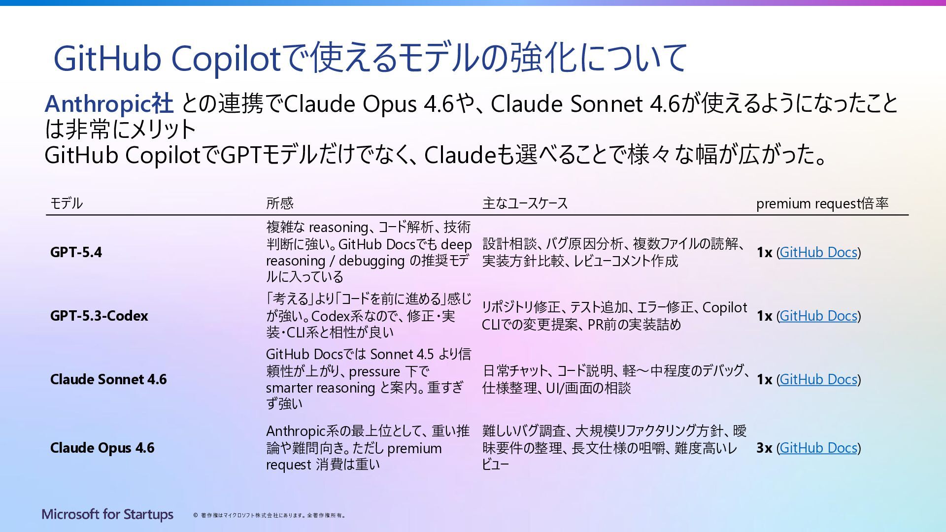 Copilotで使えるモデルの強化について Anthropic社 との連携でClaude Opus 4.6や、Claude Sonnet 4.6が使えるようになったこと は非常にメリット GitHub CopilotでGPTモデルだけでなく、Claudeも選べることで様々な幅が広がった。 モデル 所感 主なユースケース premium request倍率 GPT-5.4 複雑な reasoning、コード解析、技術 判断に強い。GitHub Docsでも deep reasoning / debugging の推奨モデ ルに入っている 設計相談、バグ原因分析、複数ファイルの読解、 実装方針比較、レビューコメント作成 1x (GitHub Docs) GPT-5.3-Codex 「考える」より「コードを前に進める」感じ が強い。Codex系なので、修正・実 装・CLI系と相性が良い リポジトリ修正、テスト追加、エラー修正、Copilot CLIでの変更提案、PR前の実装詰め 1x (GitHub Docs) Claude Sonnet 4.6 GitHub Docsでは Sonnet 4.5 より信 頼性が上がり、pressure 下で smarter reasoning と案内。重すぎ ず強い 日常チャット、コード説明、軽~中程度のデバッグ、 仕様整理、UI/画面の相談 1x (GitHub Docs) Claude Opus 4.6 Anthropic系の最上位として、重い推 論や難問向き。ただし premium request 消費は重い 難しいバグ調査、大規模リファクタリング方針、曖 昧要件の整理、長文仕様の咀嚼、難度高いレ ビュー 3x (GitHub Docs)