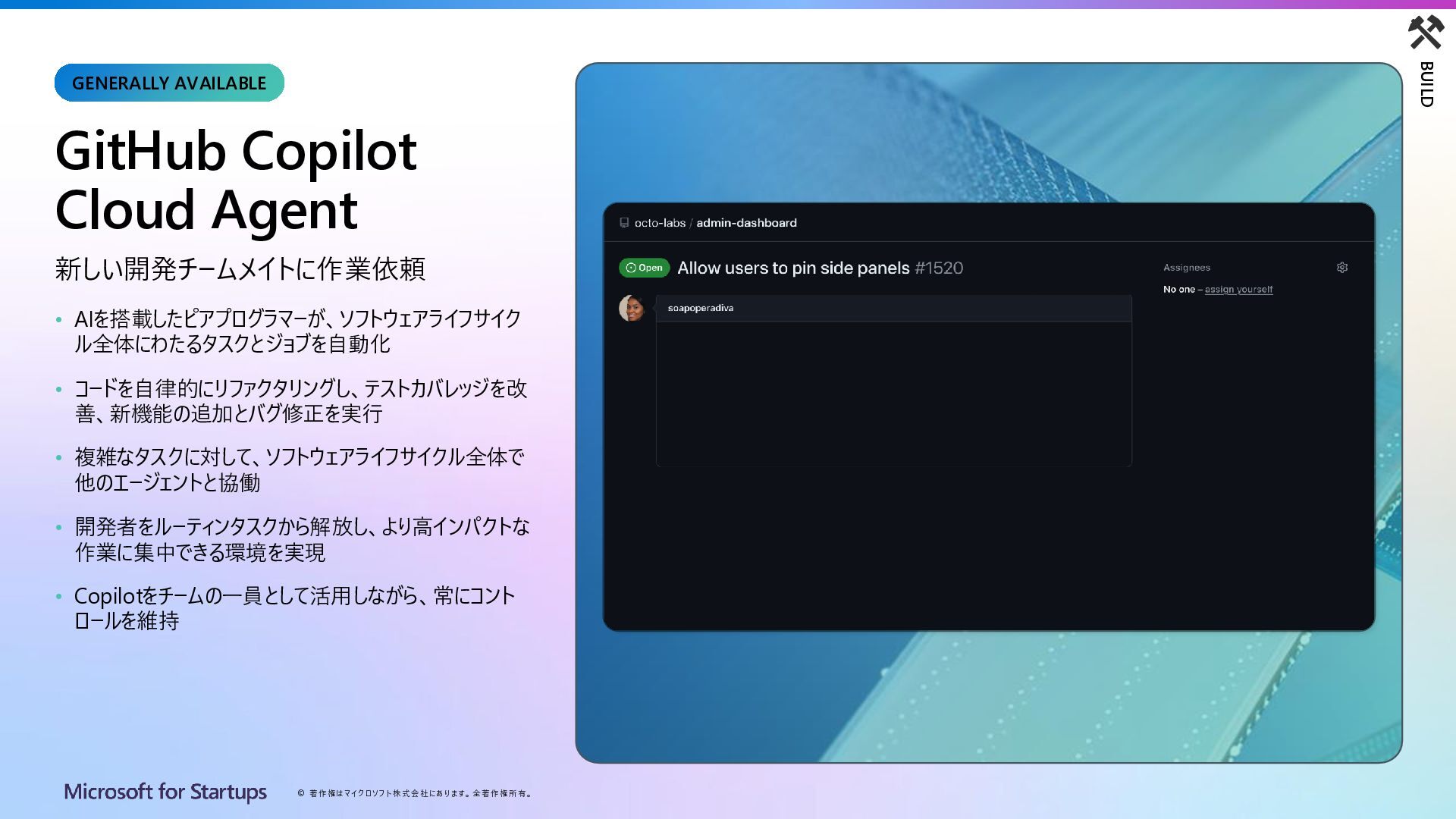 Copilot Cloud Agent 新しい開発チームメイトに作業依頼 • AIを搭載したピアプログラマーが、ソフトウェアライフサイク ル全体にわたるタスクとジョブを自動化 • コードを自律的にリファクタリングし、テストカバレッジを改 善、新機能の追加とバグ修正を実行 • 複雑なタスクに対して、ソフトウェアライフサイクル全体で 他のエージェントと協働 • 開発者をルーティンタスクから解放し、より高インパクトな 作業に集中できる環境を実現 • Copilotをチームの一員として活用しながら、常にコント ロールを維持 GENERALLY AVAILABLE BUILD