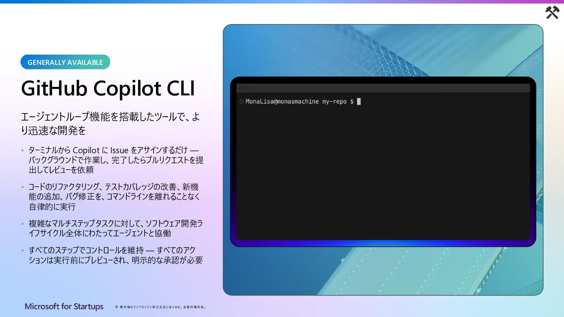 Copilot CLI エージェントループ機能を搭載したツールで、よ り迅速な開発を • ターミナルから Copilot に Issue をアサインするだけ — バックグラウンドで作業し、完了したらプルリクエストを提 出してレビューを依頼 • コードのリファクタリング、テストカバレッジの改善、新機 能の追加、バグ修正を、コマンドラインを離れることなく 自律的に実行 • 複雑なマルチステップタスクに対して、ソフトウェア開発ラ イフサイクル全体にわたってエージェントと協働 • すべてのステップでコントロールを維持 — すべてのアク ションは実行前にプレビューされ、明示的な承認が必要 GENERALLY AVAILABLE