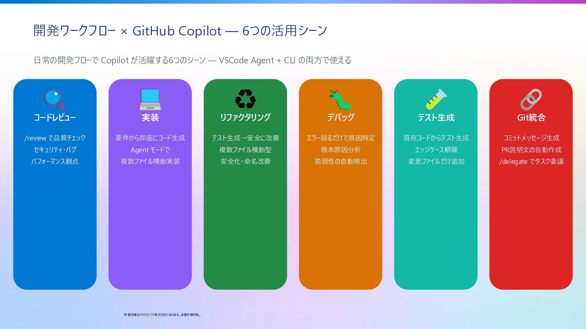 14. 開発ワークフロー × GitHub Copilot — 6つの活用シーン © 著作権はマイクロソフト株式会社にあります。全著作権所有。 日常の開発フローで Copilot