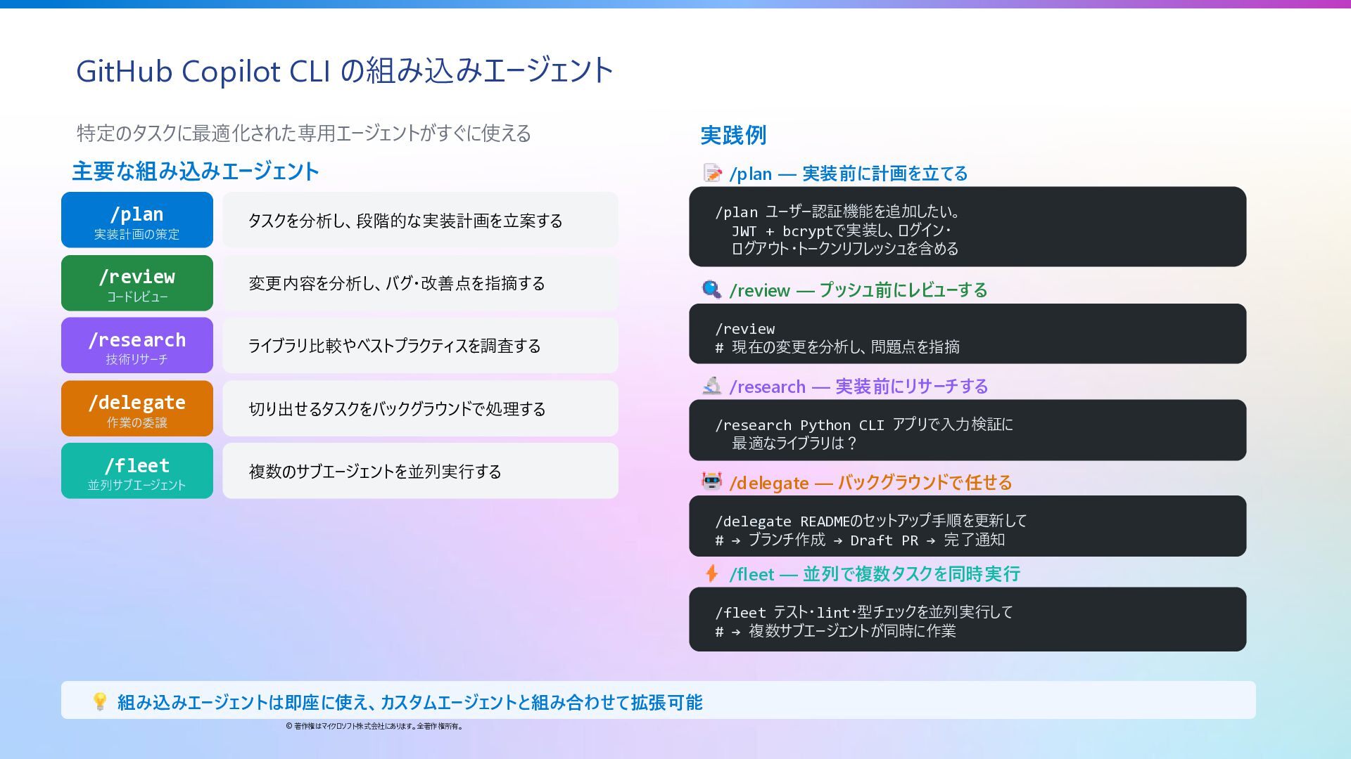 タスクを分析し、段階的な実装計画を立案する /review コードレビュー 変更内容を分析し、バグ・改善点を指摘する /research 技術リサーチ ライブラリ比較やベストプラクティスを調査する /delegate 作業の委譲 切り出せるタスクをバックグラウンドで処理する /fleet 並列サブエージェント 複数のサブエージェントを並列実行する 実践例 /plan — 実装前に計画を立てる /plan ユーザー認証機能を追加したい。 JWT + bcryptで実装し、ログイン・ ログアウト・トークンリフレッシュを含める /review — プッシュ前にレビューする /review # 現在の変更を分析し、問題点を指摘 /research — 実装前にリサーチする /research Python CLI アプリで入力検証に 最適なライブラリは? /delegate — バックグラウンドで任せる /delegate READMEのセットアップ手順を更新して # → ブランチ作成 → Draft PR → 完了通知 組み込みエージェントは即座に使え、カスタムエージェントと組み合わせて拡張可能 /fleet — 並列で複数タスクを同時実行 /fleet テスト・lint・型チェックを並列実行して # → 複数サブエージェントが同時に作業
