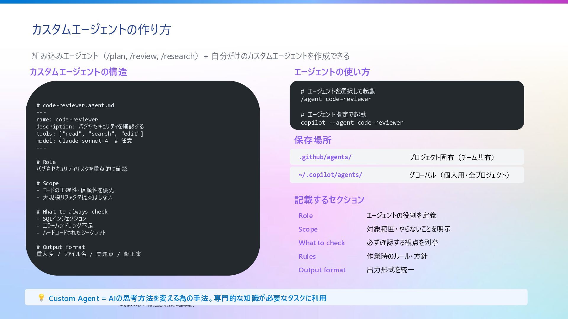 16. カスタムエージェントの作り方 © 著作権はマイクロソフト株式会社にあります。全著作権所有。 組み込みエージェント(/plan, /review, /research)+ 自分だけのカスタムエージェントを作成できる カスタムエージェントの構造 # code-reviewer.agent.md