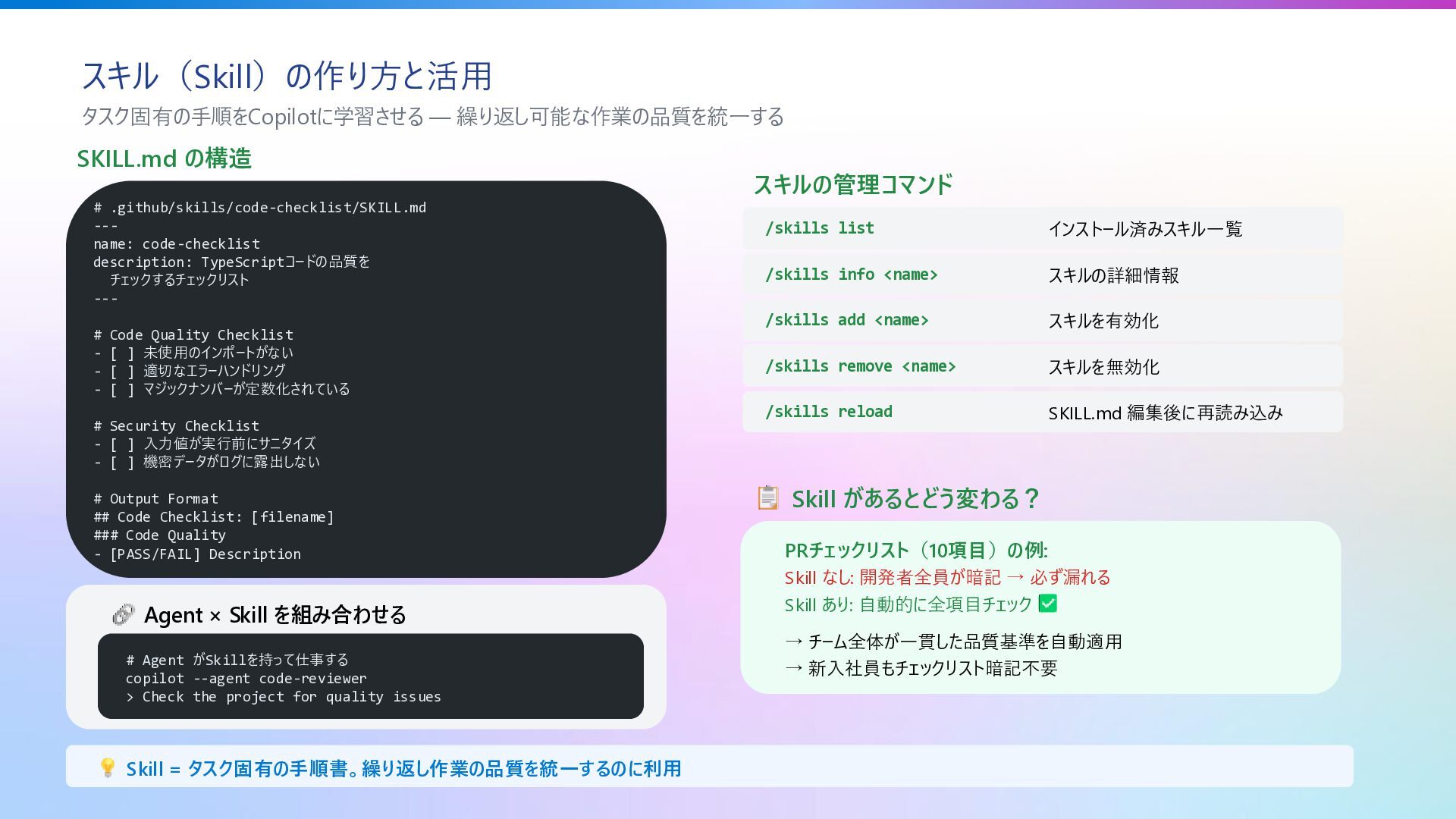 --- name: code-checklist description: TypeScriptコードの品質を チェックするチェックリスト --- # Code Quality Checklist - [ ] 未使用のインポートがない - [ ] 適切なエラーハンドリング - [ ] マジックナンバーが定数化されている # Security Checklist - [ ] 入力値が実行前にサニタイズ - [ ] 機密データがログに露出しない # Output Format ## Code Checklist: [filename] ### Code Quality - [PASS/FAIL] Description スキルの管理コマンド /skills list インストール済みスキル一覧 /skills info <name> スキルの詳細情報 /skills add <name> スキルを有効化 /skills remove <name> スキルを無効化 /skills reload SKILL.md 編集後に再読み込み Skill があるとどう変わる? PRチェックリスト(10項目)の例: Skill なし: 開発者全員が暗記 → 必ず漏れる Skill あり: 自動的に全項目チェック → チーム全体が一貫した品質基準を自動適用 → 新入社員もチェックリスト暗記不要 Agent × Skill を組み合わせる # Agent がSkillを持って仕事する copilot --agent code-reviewer > Check the project for quality issues Skill = タスク固有の手順書。繰り返し作業の品質を統一するのに利用