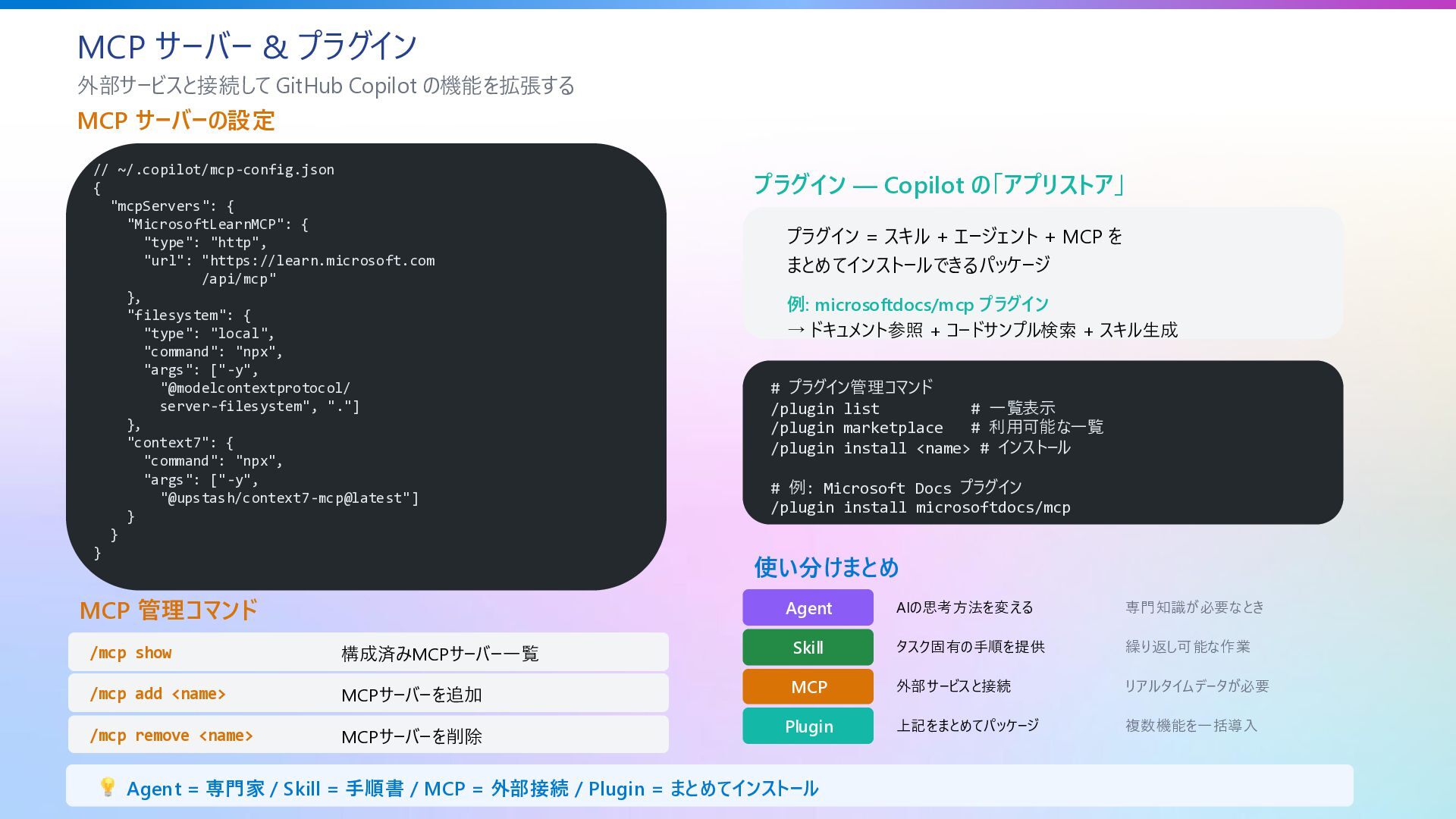 MCP サーバーの設定 // ~/.copilot/mcp-config.json { "mcpServers": { "MicrosoftLearnMCP": { "type": "http", "url": "https://learn.microsoft.com /api/mcp" }, "filesystem": { "type": "local", "command": "npx", "args": ["-y", "@modelcontextprotocol/ server-filesystem", "."] }, "context7": { "command": "npx", "args": ["-y", "@upstash/context7-mcp@latest"] } } } MCP 管理コマンド /mcp show 構成済みMCPサーバー一覧 /mcp add <name> MCPサーバーを追加 /mcp remove <name> MCPサーバーを削除 プラグイン — Copilot の「アプリストア」 プラグイン = スキル + エージェント + MCP を まとめてインストールできるパッケージ 例: microsoftdocs/mcp プラグイン → ドキュメント参照 + コードサンプル検索 + スキル生成 # プラグイン管理コマンド /plugin list # 一覧表示 /plugin marketplace # 利用可能な一覧 /plugin install <name> # インストール # 例: Microsoft Docs プラグイン /plugin install microsoftdocs/mcp 使い分けまとめ Agent AIの思考方法を変える 専門知識が必要なとき Skill タスク固有の手順を提供 繰り返し可能な作業 MCP 外部サービスと接続 リアルタイムデータが必要 Plugin 上記をまとめてパッケージ 複数機能を一括導入 Agent = 専門家 / Skill = 手順書 / MCP = 外部接続 / Plugin = まとめてインストール