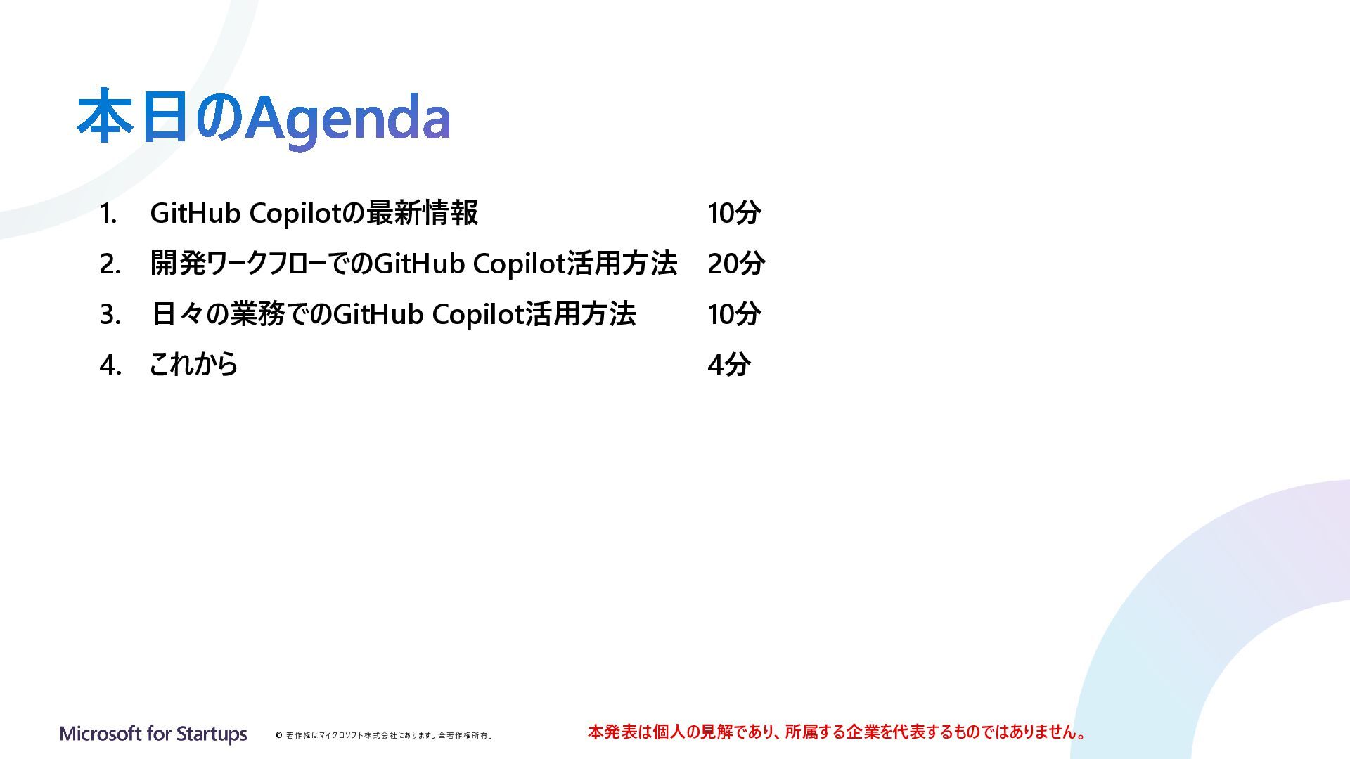 1. GitHub Copilotの最新情報 10分 2. 開発ワークフローでのGitHub Copilot活用方法 20分 3. 日々の業務でのGitHub Copilot活用方法 10分 4. これから 4分 本発表は個人の見解であり、所属する企業を代表するものではありません。