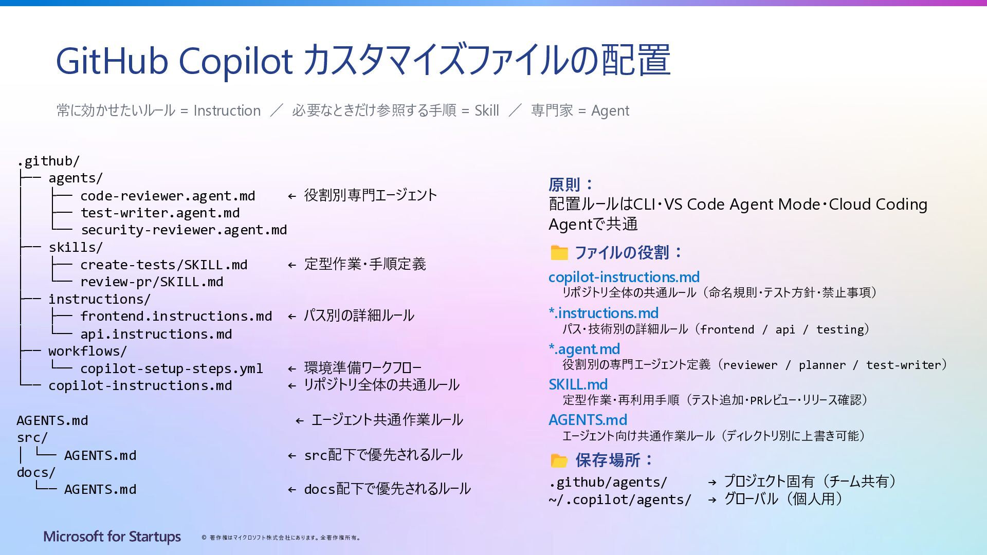Copilot カスタマイズファイルの配置 .github/ ├── agents/ │ ├── code-reviewer.agent.md ← 役割別専門エージェント │ ├── test-writer.agent.md │ └── security-reviewer.agent.md ├── skills/ │ ├── create-tests/SKILL.md ← 定型作業・手順定義 │ └── review-pr/SKILL.md ├── instructions/ │ ├── frontend.instructions.md ← パス別の詳細ルール │ └── api.instructions.md ├── workflows/ │ └── copilot-setup-steps.yml ← 環境準備ワークフロー └── copilot-instructions.md ← リポジトリ全体の共通ルール AGENTS.md ← エージェント共通作業ルール src/ │ └── AGENTS.md ← src配下で優先されるルール docs/ └── AGENTS.md ← docs配下で優先されるルール 原則: 配置ルールはCLI・VS Code Agent Mode・Cloud Coding Agentで共通 ファイルの役割: copilot-instructions.md リポジトリ全体の共通ルール(命名規則・テスト方針・禁止事項) *.instructions.md パス・技術別の詳細ルール(frontend / api / testing) *.agent.md 役割別の専門エージェント定義(reviewer / planner / test-writer) SKILL.md 定型作業・再利用手順(テスト追加・PRレビュー・リリース確認) AGENTS.md エージェント向け共通作業ルール(ディレクトリ別に上書き可能) 保存場所: .github/agents/ → プロジェクト固有(チーム共有) ~/.copilot/agents/ → グローバル(個人用) 常に効かせたいルール = Instruction / 必要なときだけ参照する手順 = Skill / 専門家 = Agent