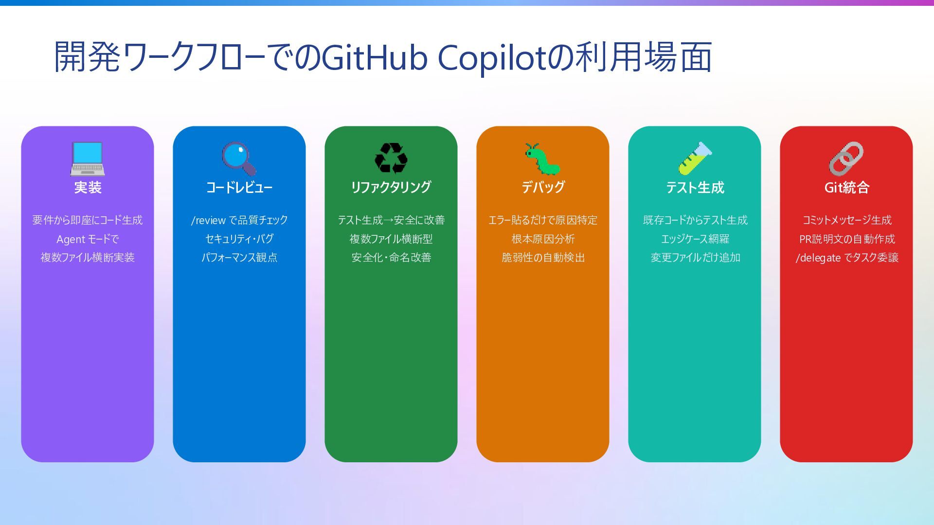 パフォーマンス観点 リファクタリング テスト生成→安全に改善 複数ファイル横断型 安全化・命名改善 デバッグ エラー貼るだけで原因特定 根本原因分析 脆弱性の自動検出 テスト生成 既存コードからテスト生成 エッジケース網羅 変更ファイルだけ追加 Git統合 コミットメッセージ生成 PR説明文の自動作成 /delegate でタスク委譲 開発ワークフローでのGitHub Copilotの利用場面