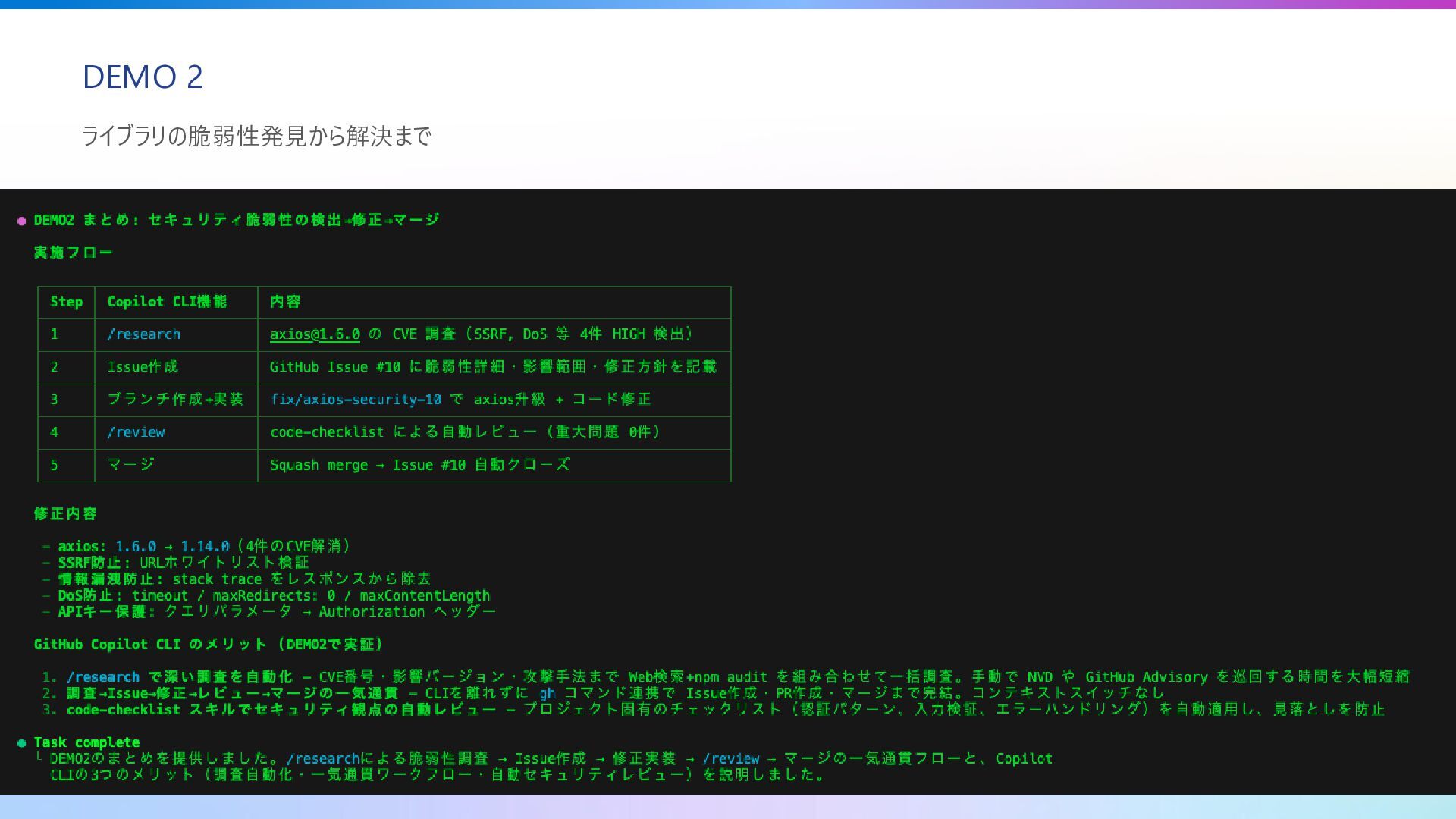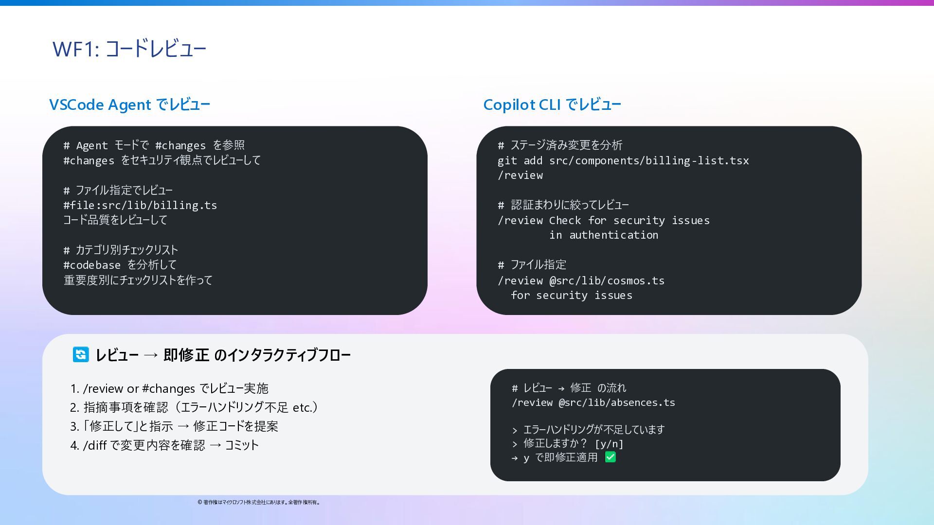 #changes を参照 #changes をセキュリティ観点でレビューして # ファイル指定でレビュー #file:src/lib/billing.ts コード品質をレビューして # カテゴリ別チェックリスト #codebase を分析して 重要度別にチェックリストを作って Copilot CLI でレビュー # ステージ済み変更を分析 git add src/components/billing-list.tsx /review # 認証まわりに絞ってレビュー /review Check for security issues in authentication # ファイル指定 /review @src/lib/cosmos.ts for security issues レビュー → 即修正 のインタラクティブフロー 1. /review or #changes でレビュー実施 2. 指摘事項を確認(エラーハンドリング不足 etc.) 3. 「修正して」と指示 → 修正コードを提案 4. /diff で変更内容を確認 → コミット # レビュー → 修正 の流れ /review @src/lib/absences.ts > エラーハンドリングが不足しています > 修正しますか? [y/n] → y で即修正適用