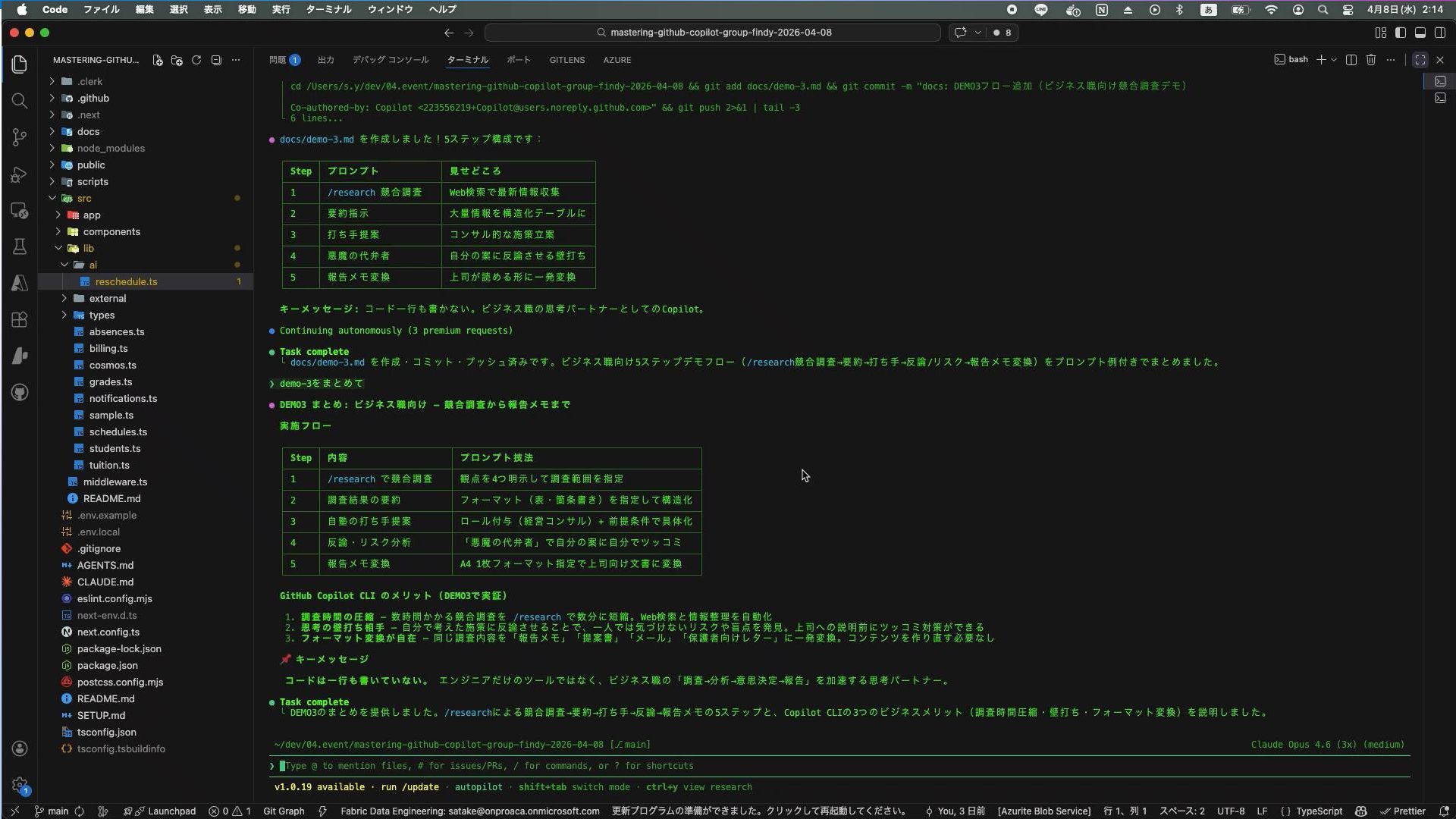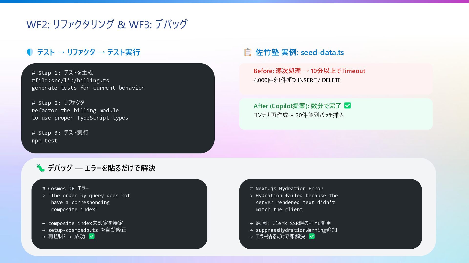 → テスト実行 # Step 1: テストを生成 #file:src/lib/billing.ts generate tests for current behavior # Step 2: リファクタ refactor the billing module to use proper TypeScript types # Step 3: テスト実行 npm test 佐竹塾 実例: seed-data.ts Before: 逐次処理 → 10分以上でTimeout 4,000件を1件ずつ INSERT / DELETE After (Copilot提案): 数分で完了 コンテナ再作成 + 20件並列バッチ挿入 デバッグ — エラーを貼るだけで解決 # Cosmos DB エラー > "The order by query does not have a corresponding composite index" → composite index未設定を特定 → setup-cosmosdb.ts を自動修正 → 再ビルド → 成功 # Next.js Hydration Error > Hydration failed because the server rendered text didn't match the client → 原因: Clerk SSR時のHTML変更 → suppressHydrationWarning追加 → エラー貼るだけで即解決