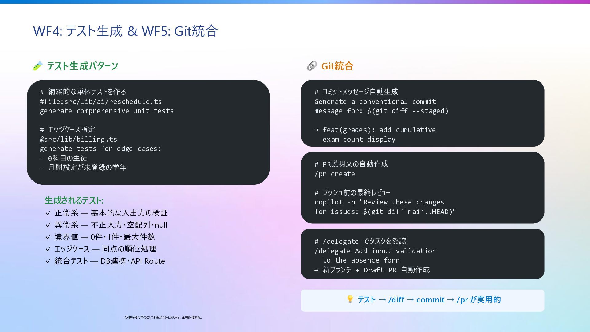 #file:src/lib/ai/reschedule.ts generate comprehensive unit tests # エッジケース指定 @src/lib/billing.ts generate tests for edge cases: - 0科目の生徒 - 月謝設定が未登録の学年 生成されるテスト: ✓ 正常系 — 基本的な入出力の検証 ✓ 異常系 — 不正入力・空配列・null ✓ 境界値 — 0件・1件・最大件数 ✓ エッジケース — 同点の順位処理 ✓ 統合テスト — DB連携・API Route Git統合 # コミットメッセージ自動生成 Generate a conventional commit message for: $(git diff --staged) → feat(grades): add cumulative exam count display # PR説明文の自動作成 /pr create # プッシュ前の最終レビュー copilot -p "Review these changes for issues: $(git diff main..HEAD)" # /delegate でタスクを委譲 /delegate Add input validation to the absence form → 新ブランチ + Draft PR 自動作成 テスト → /diff → commit → /pr が実用的