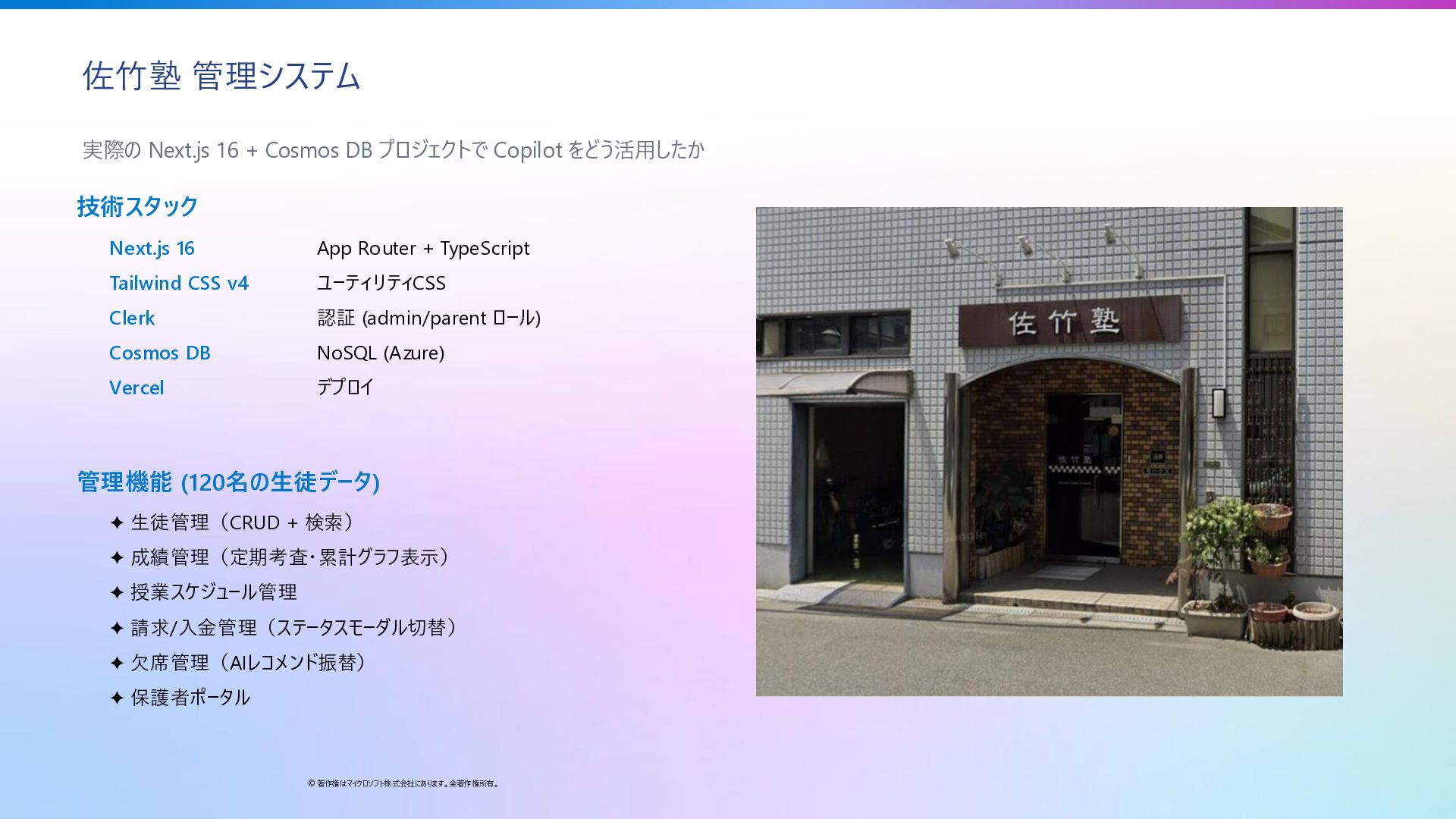 24. 佐竹塾 管理システム © 著作権はマイクロソフト株式会社にあります。全著作権所有。 実際の Next.js 16 + Cosmos DB