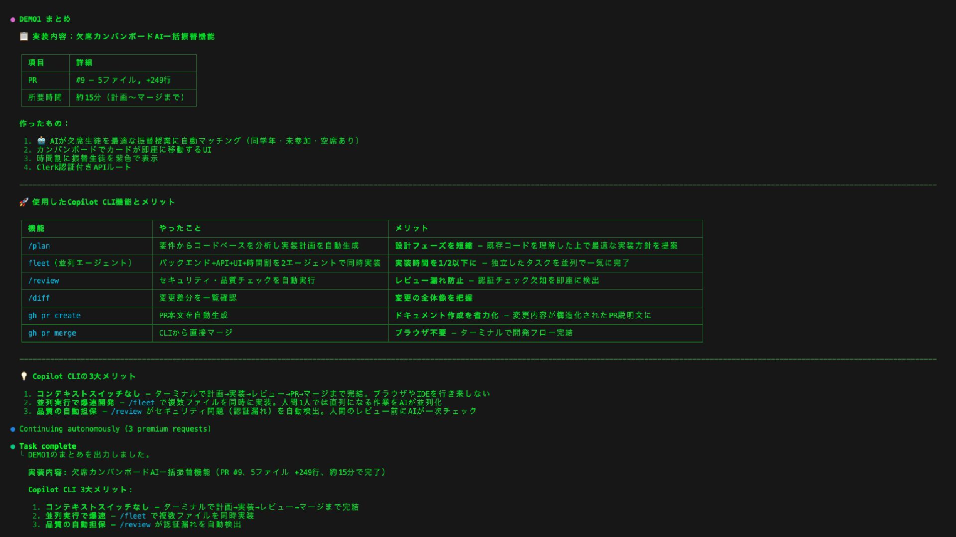 CLI で実現する「要望 → 実装」フロー 塾長の要望 「成績が下がってる 生徒を早く知りたい」 → Copilot CLI で要件整理 /plan で機能要件を 自動で整理・構造化 → 開発者が実装 Agent モードで 自動実装 + テスト → 即座に利用可能 成績分析レポートが 毎月自動生成される 非エンジニアでも今日から使えるパターン 聞くだけでOK 「〇〇を分析して」「〇〇の資料を作って」と 日本語で指示するだけ。コードは書かない。 データを渡すだけ @ でファイルを指定すれば、成績表・名簿等の 既存データをそのまま分析・変換できる。 繰り返し自動化 一度やった作業をSkillに登録すれば 毎月ワンコマンドで再実行できる。 Copilot CLI = ビジネスと開発をより早く繋ぐことが出来る。要望を伝えるだけで形になるのは非常にGood