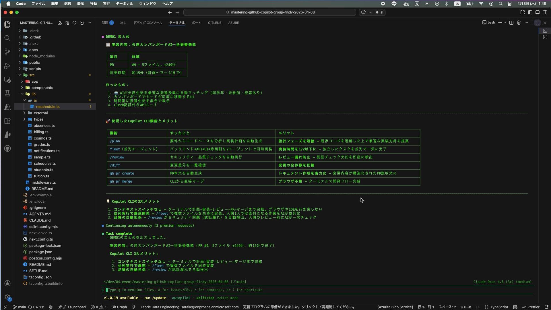 プロジェクトで Copilot をどう活用したか 技術スタック Next.js 16 App Router + TypeScript Tailwind CSS v4 ユーティリティCSS Clerk 認証 (admin/parent ロール) Cosmos DB NoSQL (Azure) Vercel デプロイ 管理機能 (120名の生徒データ) ✦ 生徒管理(CRUD + 検索) ✦ 成績管理(定期考査・累計グラフ表示) ✦ 授業スケジュール管理 ✦ 請求/入金管理(ステータスモーダル切替) ✦ 欠席管理(AIレコメンド振替) ✦ 保護者ポータル