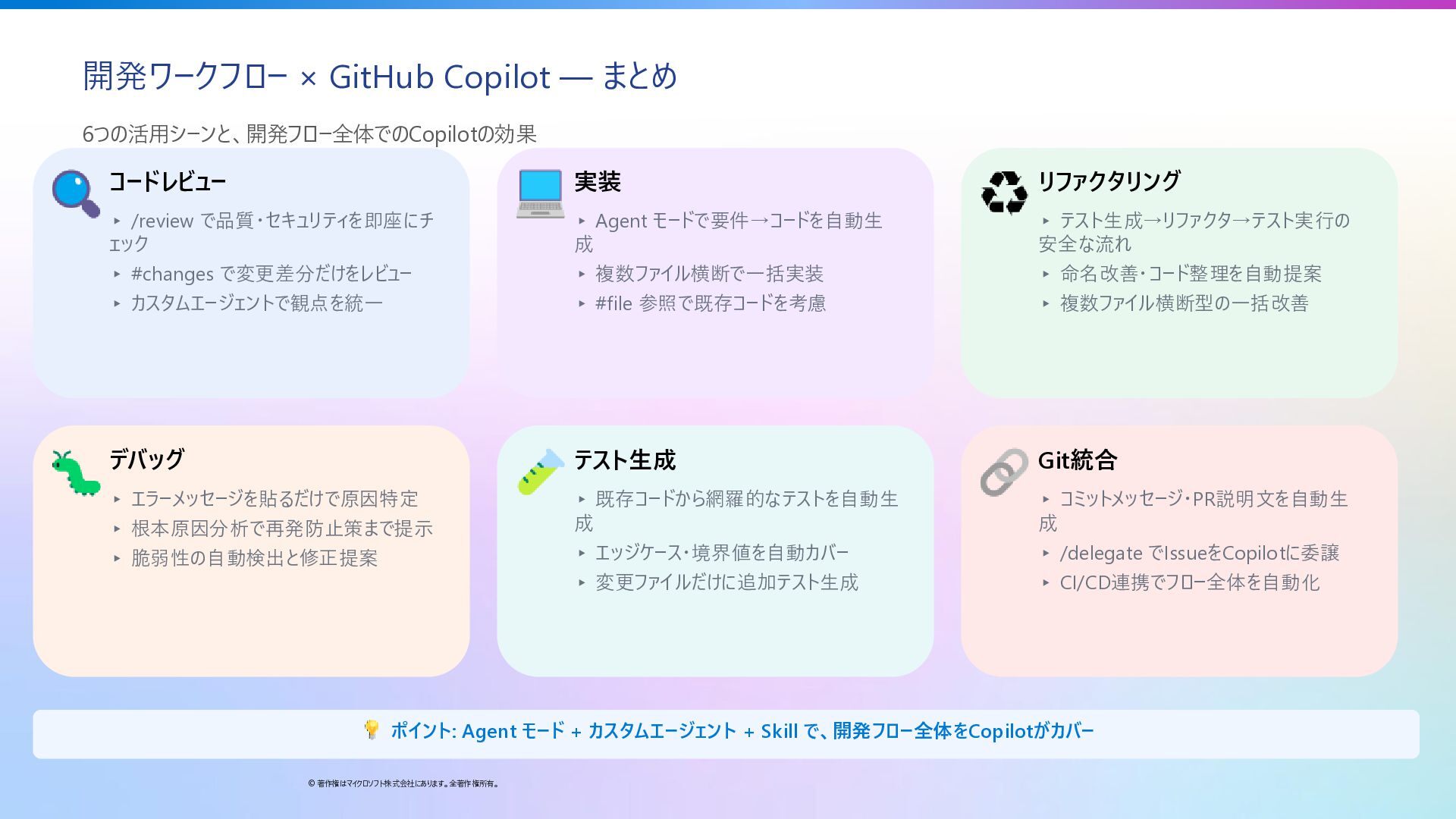 ▸ /review で品質・セキュリティを即座にチ ェック ▸ #changes で変更差分だけをレビュー ▸ カスタムエージェントで観点を統一 実装 ▸ Agent モードで要件→コードを自動生 成 ▸ 複数ファイル横断で一括実装 ▸ #file 参照で既存コードを考慮 リファクタリング ▸ テスト生成→リファクタ→テスト実行の 安全な流れ ▸ 命名改善・コード整理を自動提案 ▸ 複数ファイル横断型の一括改善 デバッグ ▸ エラーメッセージを貼るだけで原因特定 ▸ 根本原因分析で再発防止策まで提示 ▸ 脆弱性の自動検出と修正提案 テスト生成 ▸ 既存コードから網羅的なテストを自動生 成 ▸ エッジケース・境界値を自動カバー ▸ 変更ファイルだけに追加テスト生成 Git統合 ▸ コミットメッセージ・PR説明文を自動生 成 ▸ /delegate でIssueをCopilotに委譲 ▸ CI/CD連携でフロー全体を自動化 ポイント: Agent モード + カスタムエージェント + Skill で、開発フロー全体をCopilotがカバー