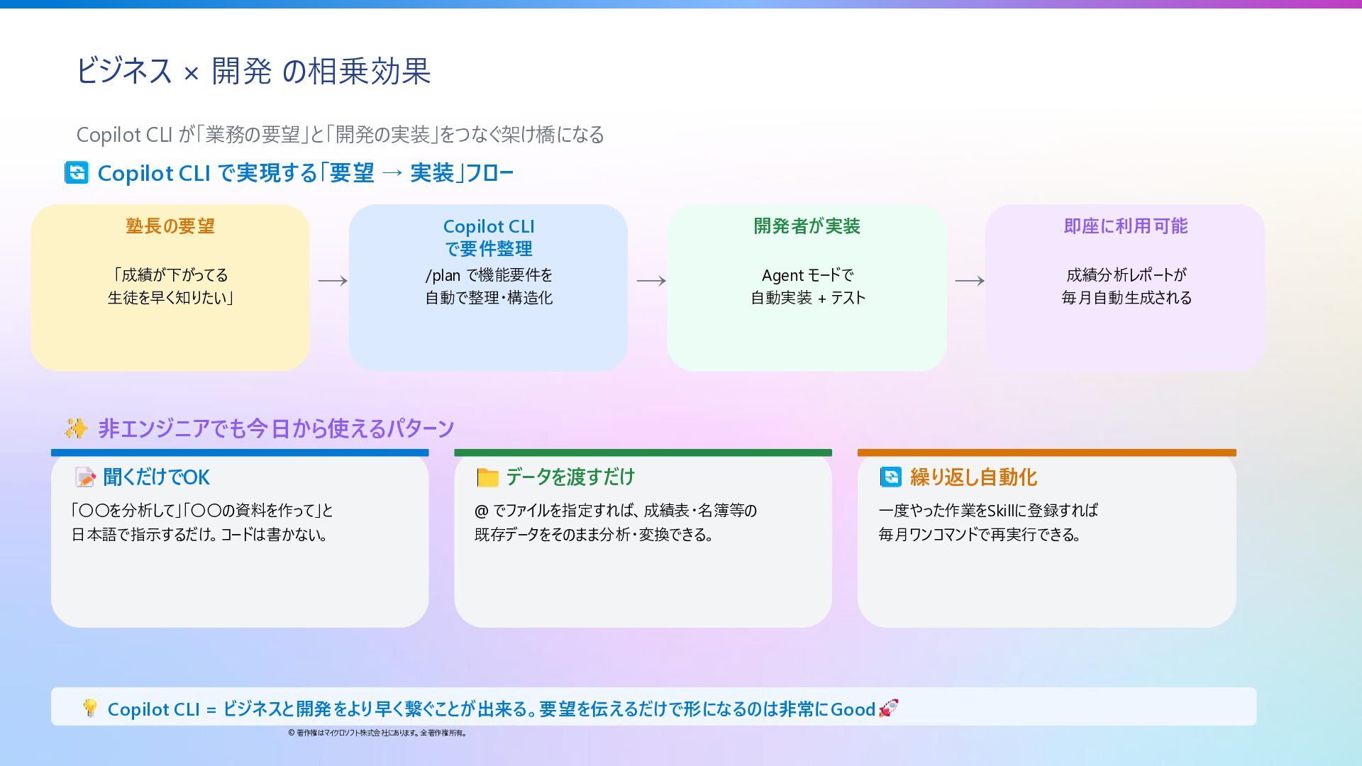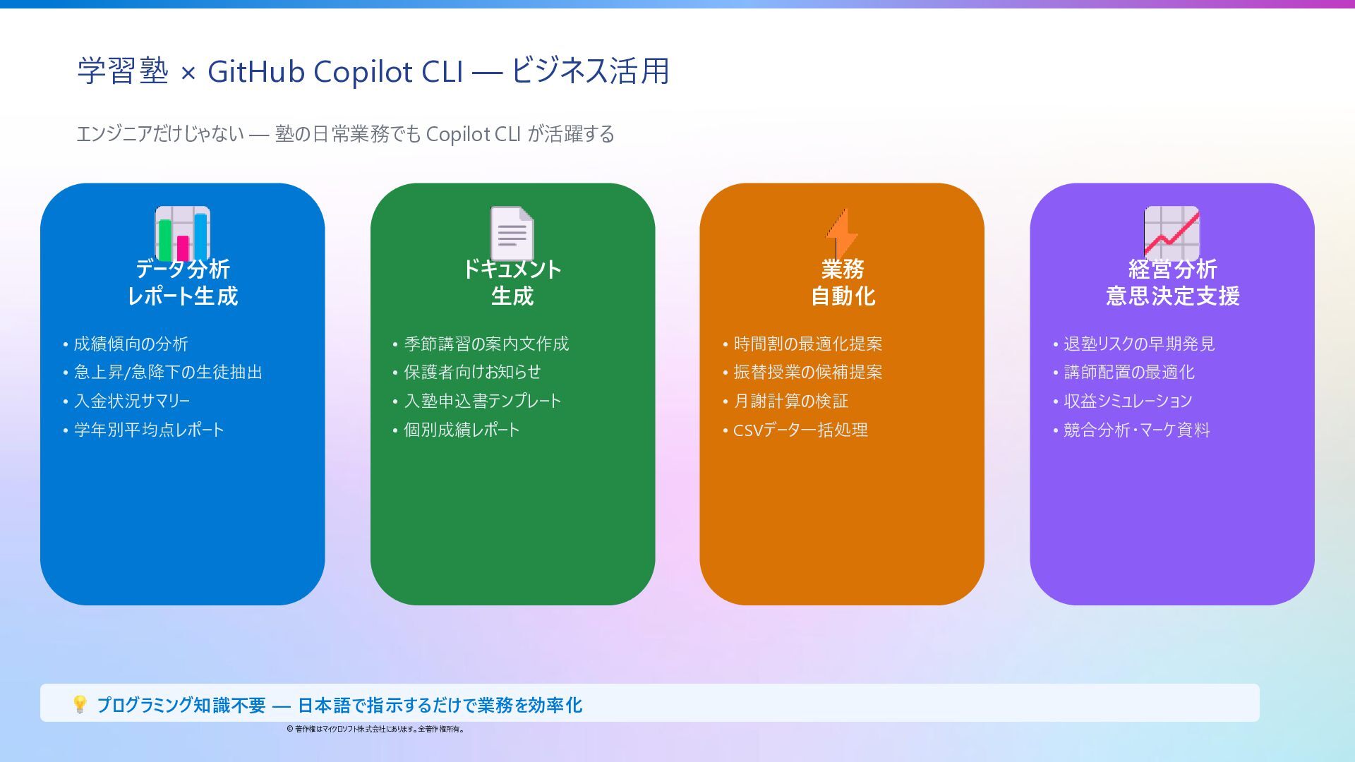 26. 学習塾 × GitHub Copilot CLI — ビジネス活用 © 著作権はマイクロソフト株式会社にあります。全著作権所有。 エンジニアだけじゃない