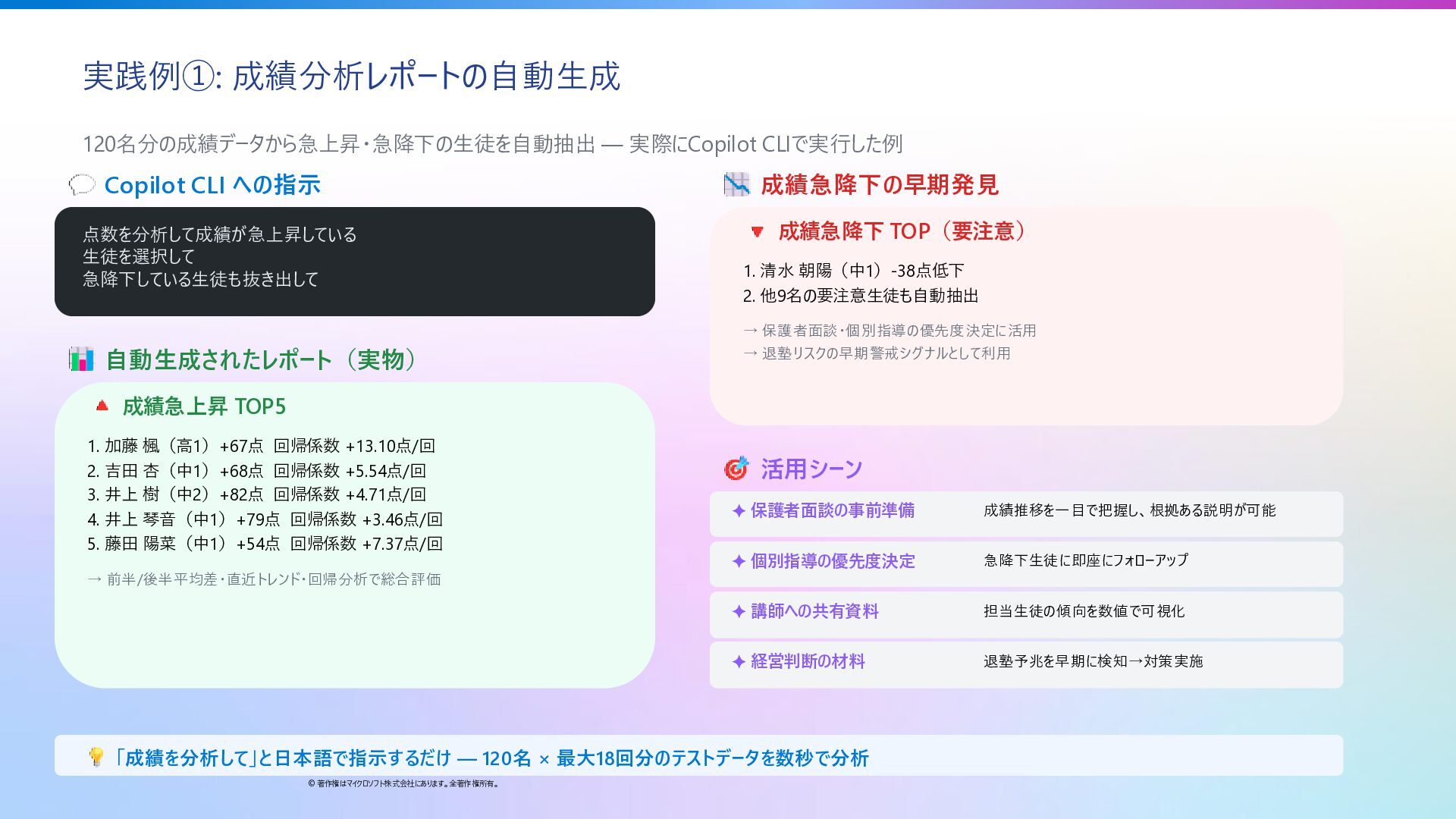 27. 実践例①: 成績分析レポートの自動生成 © 著作権はマイクロソフト株式会社にあります。全著作権所有。 120名分の成績データから急上昇・急降下の生徒を自動抽出 — 実際にCopilot CLIで実行した例 Copilot CLI