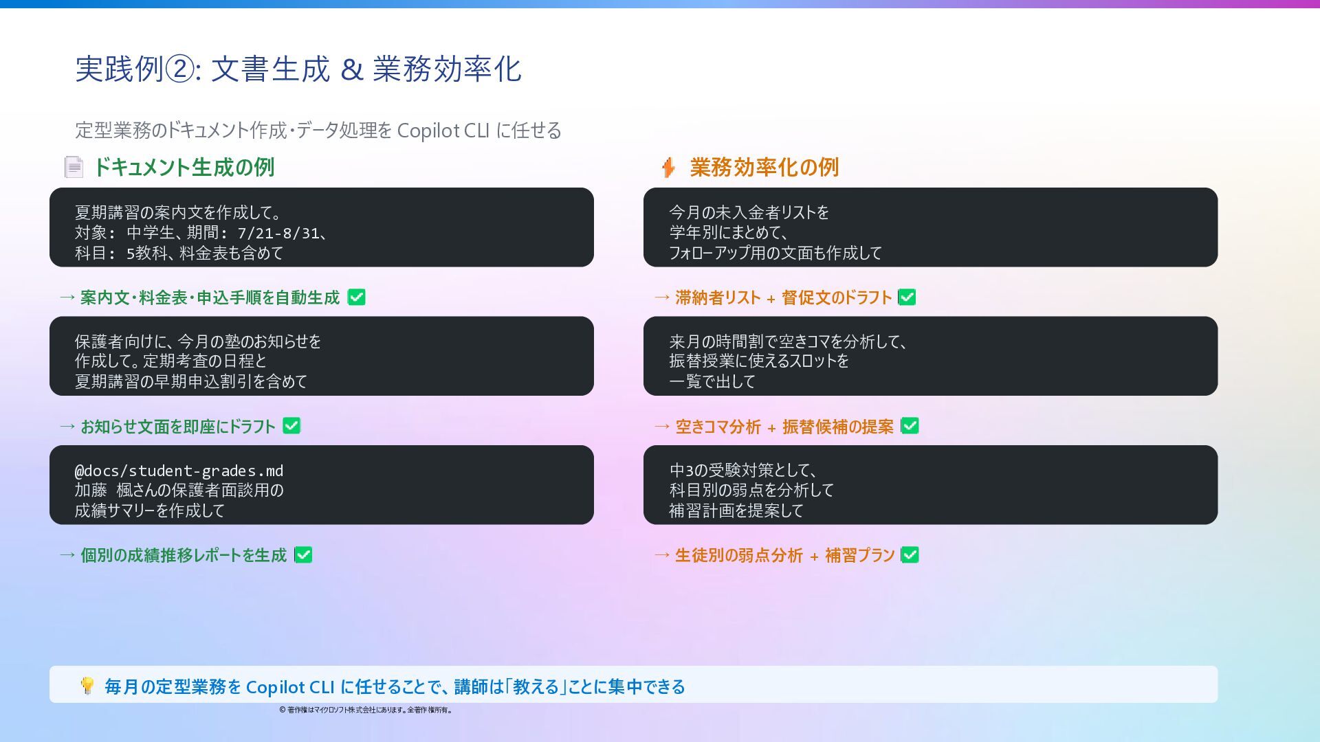 ドキュメント生成の例 夏期講習の案内文を作成して。 対象: 中学生、期間: 7/21-8/31、 科目: 5教科、料金表も含めて → 案内文・料金表・申込手順を自動生成 保護者向けに、今月の塾のお知らせを 作成して。定期考査の日程と 夏期講習の早期申込割引を含めて → お知らせ文面を即座にドラフト @docs/student-grades.md 加藤 楓さんの保護者面談用の 成績サマリーを作成して → 個別の成績推移レポートを生成 業務効率化の例 今月の未入金者リストを 学年別にまとめて、 フォローアップ用の文面も作成して → 滞納者リスト + 督促文のドラフト 来月の時間割で空きコマを分析して、 振替授業に使えるスロットを 一覧で出して → 空きコマ分析 + 振替候補の提案 中3の受験対策として、 科目別の弱点を分析して 補習計画を提案して → 生徒別の弱点分析 + 補習プラン 毎月の定型業務を Copilot CLI に任せることで、講師は「教える」ことに集中できる
