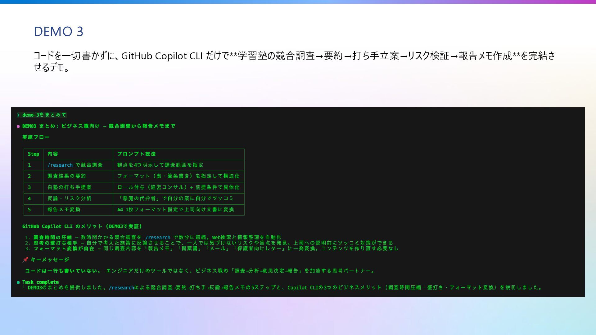 — 塾の日常業務でも Copilot CLI が活躍する データ分析 レポート生成 • 成績傾向の分析 • 急上昇/急降下の生徒抽出 • 入金状況サマリー • 学年別平均点レポート ドキュメント 生成 • 季節講習の案内文作成 • 保護者向けお知らせ • 入塾申込書テンプレート • 個別成績レポート 業務 自動化 • 時間割の最適化提案 • 振替授業の候補提案 • 月謝計算の検証 • CSVデータ一括処理 経営分析 意思決定支援 • 退塾リスクの早期発見 • 講師配置の最適化 • 収益シミュレーション • 競合分析・マーケ資料 プログラミング知識不要 — 日本語で指示するだけで業務を効率化
