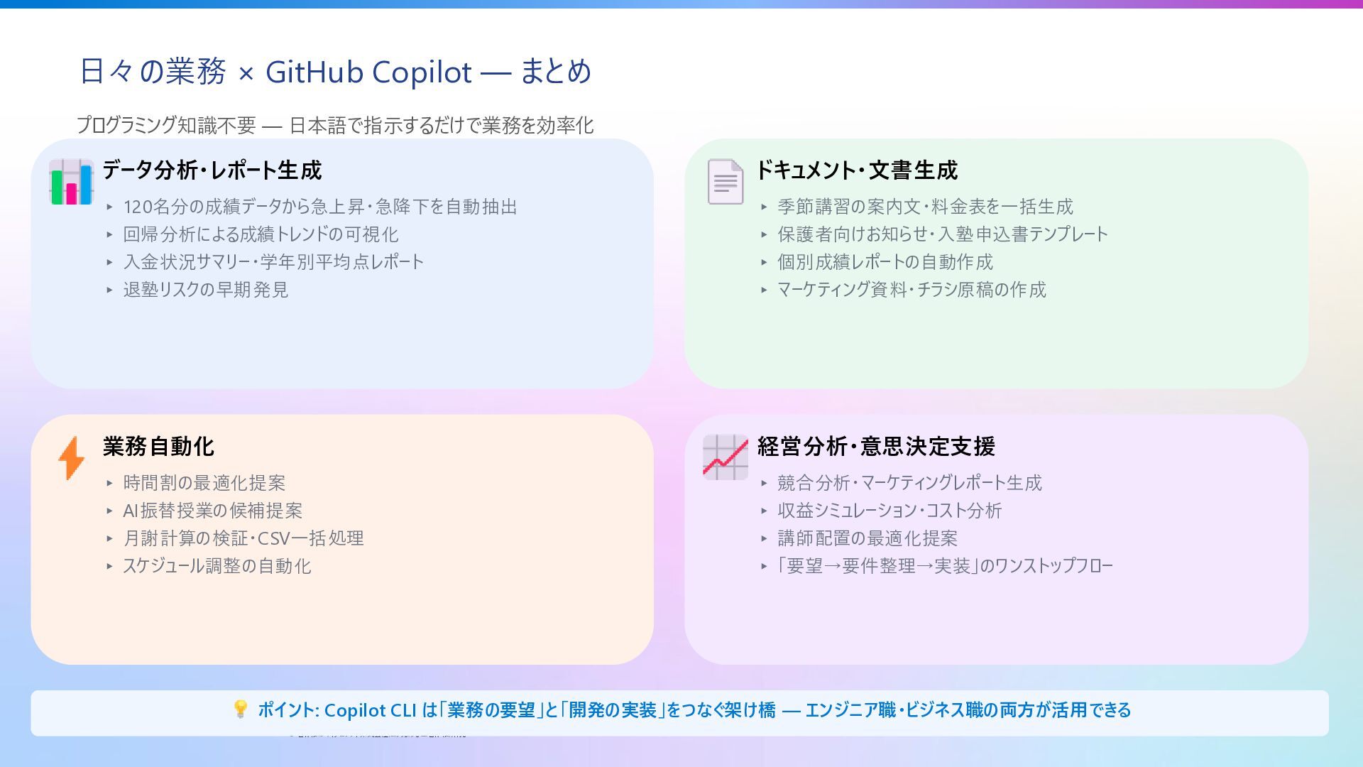 日本語で指示するだけで業務を効率化 データ分析・レポート生成 ▸ 120名分の成績データから急上昇・急降下を自動抽出 ▸ 回帰分析による成績トレンドの可視化 ▸ 入金状況サマリー・学年別平均点レポート ▸ 退塾リスクの早期発見 ドキュメント・文書生成 ▸ 季節講習の案内文・料金表を一括生成 ▸ 保護者向けお知らせ・入塾申込書テンプレート ▸ 個別成績レポートの自動作成 ▸ マーケティング資料・チラシ原稿の作成 業務自動化 ▸ 時間割の最適化提案 ▸ AI振替授業の候補提案 ▸ 月謝計算の検証・CSV一括処理 ▸ スケジュール調整の自動化 経営分析・意思決定支援 ▸ 競合分析・マーケティングレポート生成 ▸ 収益シミュレーション・コスト分析 ▸ 講師配置の最適化提案 ▸ 「要望→要件整理→実装」のワンストップフロー ポイント: Copilot CLI は「業務の要望」と「開発の実装」をつなぐ架け橋 — エンジニア職・ビジネス職の両方が活用できる