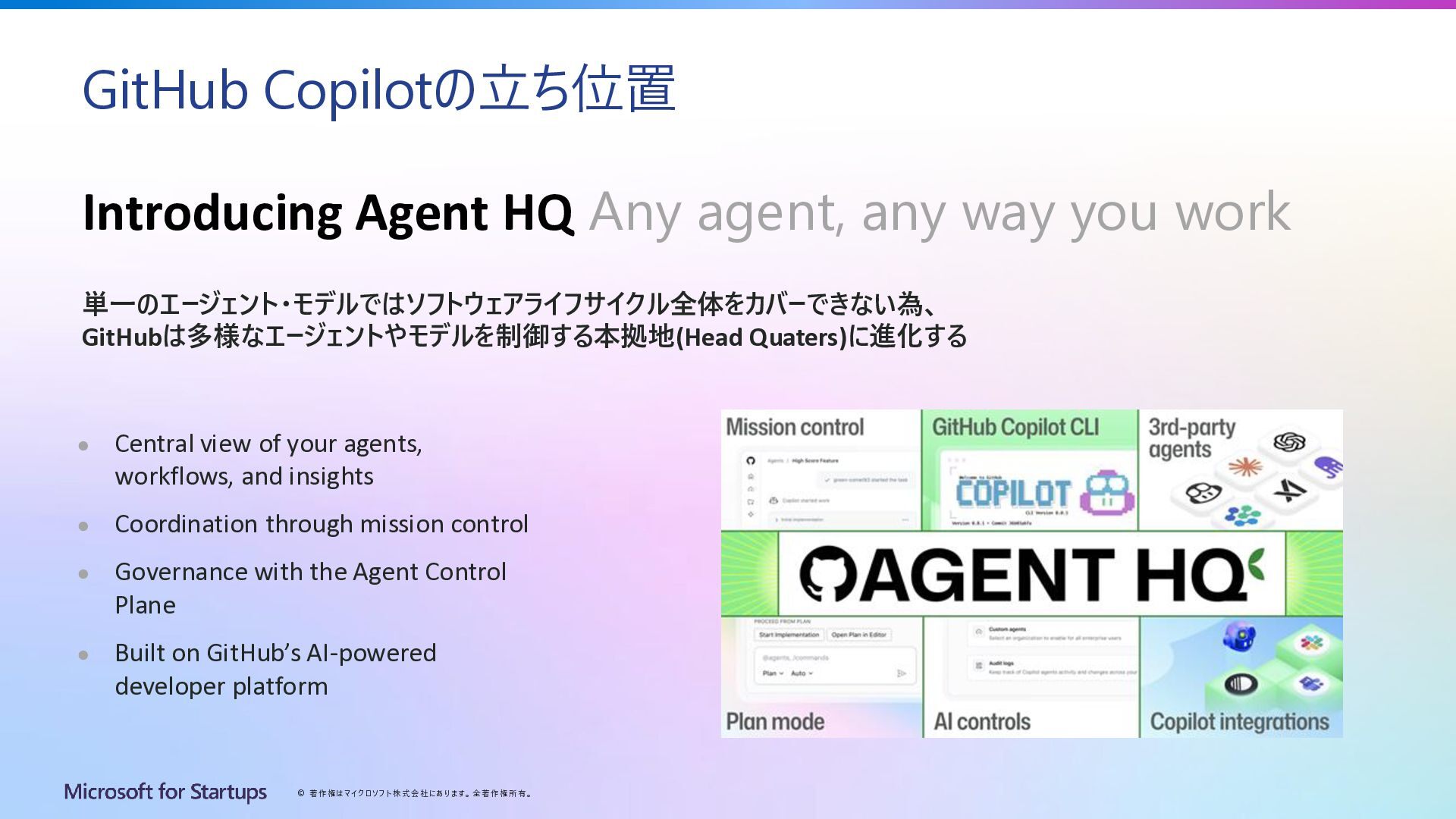 Copilotの立ち位置 Introducing Agent HQ Any agent, any way you work • Central view of your agents, workflows, and insights • Coordination through mission control • Governance with the Agent Control Plane • Built on GitHub’s AI-powered developer platform 単一のエージェント・モデルではソフトウェアライフサイクル全体をカバーできない為、 GitHubは多様なエージェントやモデルを制御する本拠地(Head Quaters)に進化する