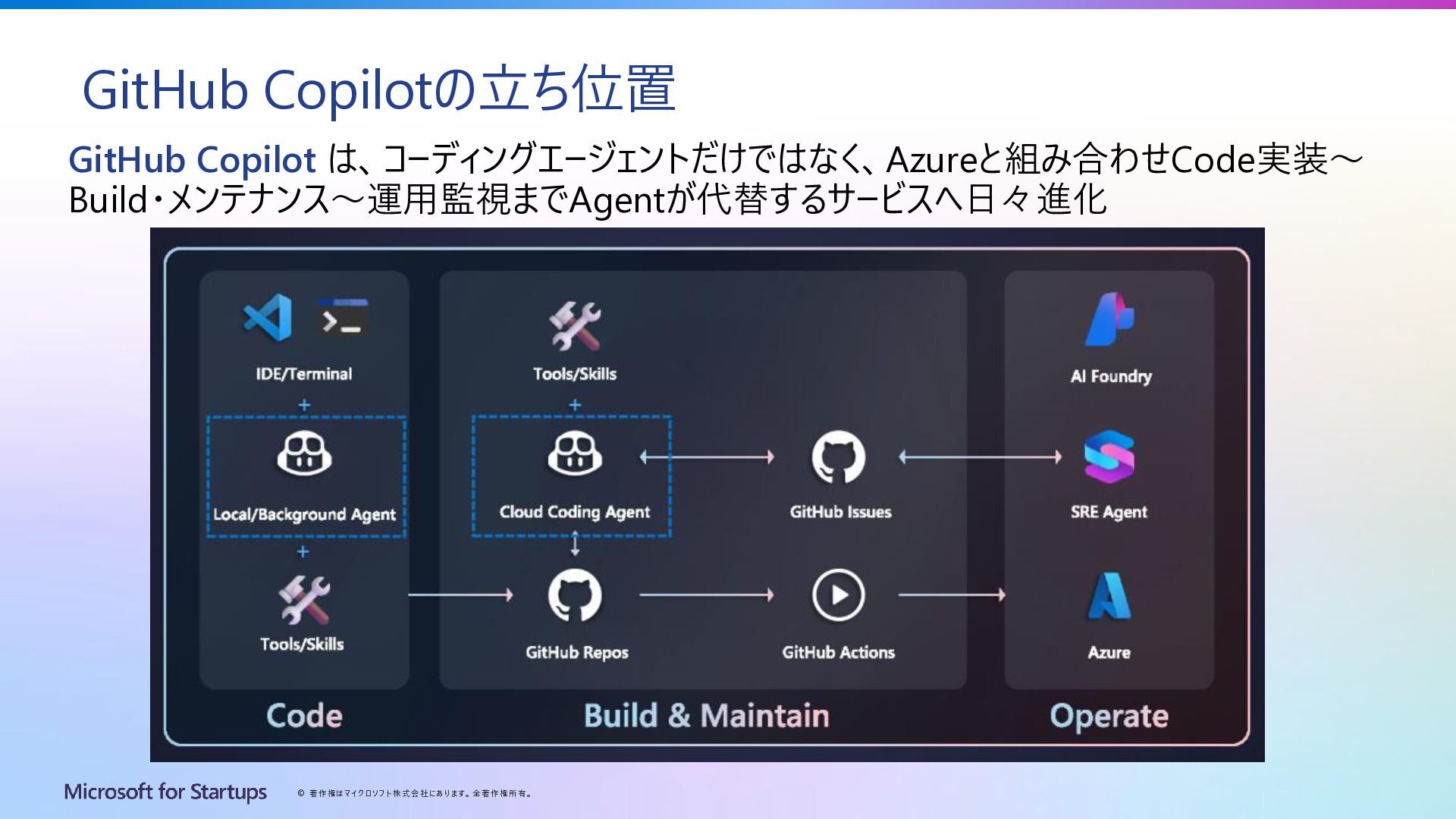 Copilotの立ち位置 GitHub Copilot は、コーディングエージェントだけではなく、Azureと組み合わせCode実装~ Build・メンテナンス~運用監視までAgentが代替するサービスへ日々進化