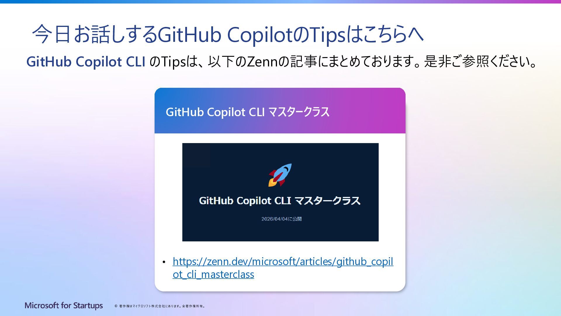 ト 株式会社にあ り ます 。 全著作権所有。 今日お話しするGitHub CopilotのTipsはこちらへ GitHub Copilot CLI のTipsは、以下のZennの記事にまとめております。是非ご参照ください。