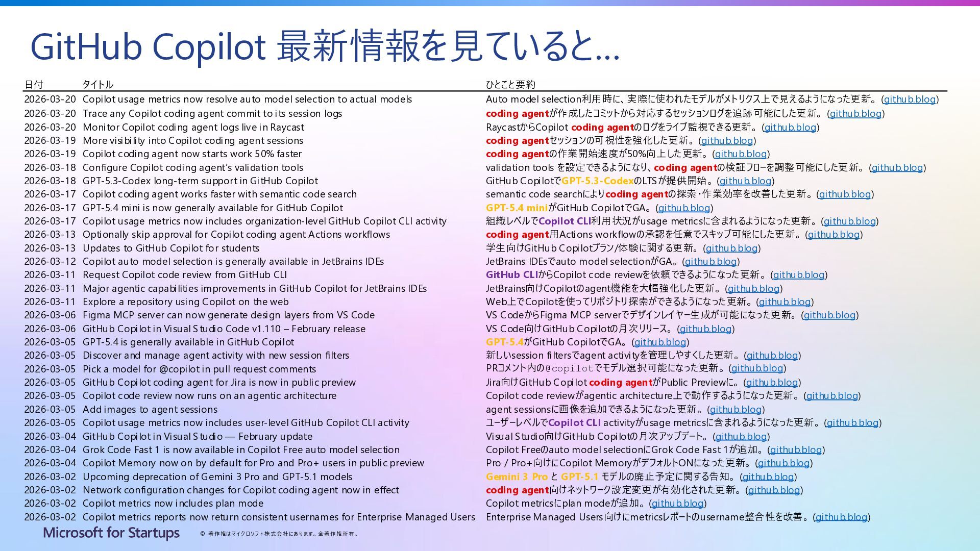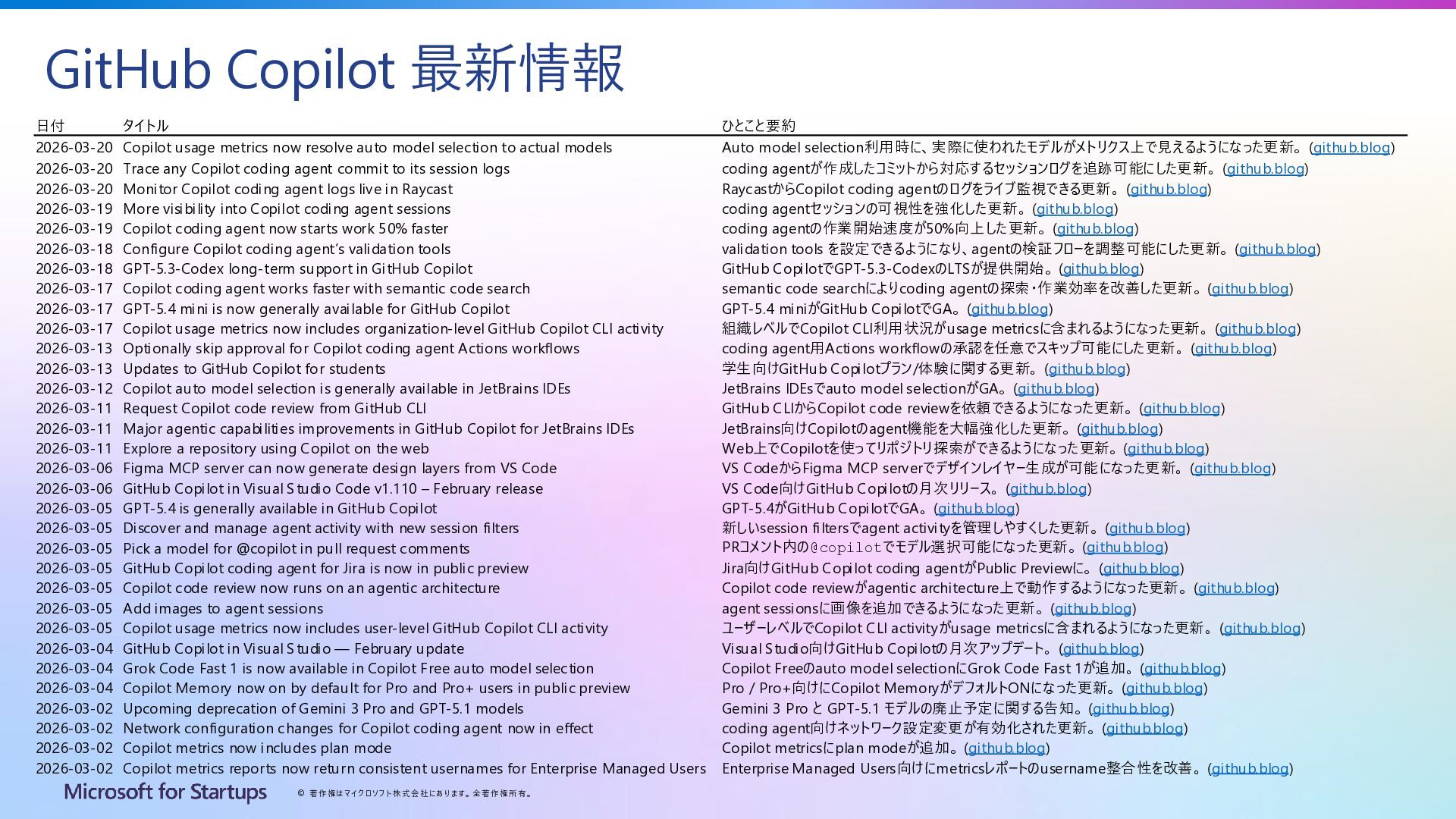 Copilot 最新情報を見ていると… 日付 タイトル ひとこと要約 2026-03-20 Copilot usage metrics now resolve auto model selection to actual models Auto model selection利用時に、実際に使われたモデルがメトリクス上で見えるようになった更新。 (github.blog) 2026-03-20 Trace any Copilot coding agent commit to its session logs coding agentが作成したコミットから対応するセッションログを追跡可能にした更新。 (github.blog) 2026-03-20 Monitor Copilot coding agent logs live in Raycast RaycastからCopilot coding agentのログをライブ監視できる更新。 (github.blog) 2026-03-19 More visibility into Copilot coding agent sessions coding agentセッションの可視性を強化した更新。 (github.blog) 2026-03-19 Copilot coding agent now starts work 50% faster coding agentの作業開始速度が50%向上した更新。 (github.blog) 2026-03-18 Configure Copilot coding agent’s validation tools validation tools を設定できるようになり、coding agentの検証フローを調整可能にした更新。 (github.blog) 2026-03-18 GPT-5.3-Codex long-term support in GitHub Copilot GitHub CopilotでGPT-5.3-CodexのLTSが提供開始。 (github.blog) 2026-03-17 Copilot coding agent works faster with semantic code search semantic code searchによりcoding agentの探索・作業効率を改善した更新。 (github.blog) 2026-03-17 GPT-5.4 mini is now generally available for GitHub Copilot GPT-5.4 miniがGitHub CopilotでGA。 (github.blog) 2026-03-17 Copilot usage metrics now includes organization-level GitHub Copilot CLI activity 組織レベルでCopilot CLI利用状況がusage metricsに含まれるようになった更新。 (github.blog) 2026-03-13 Optionally skip approval for Copilot coding agent Actions workflows coding agent用Actions workflowの承認を任意でスキップ可能にした更新。 (github.blog) 2026-03-13 Updates to GitHub Copilot for students 学生向けGitHub Copilotプラン/体験に関する更新。 (github.blog) 2026-03-12 Copilot auto model selection is generally available in JetBrains IDEs JetBrains IDEsでauto model selectionがGA。 (github.blog) 2026-03-11 Request Copilot code review from GitHub CLI GitHub CLIからCopilot code reviewを依頼できるようになった更新。 (github.blog) 2026-03-11 Major agentic capabilities improvements in GitHub Copilot for JetBrains IDEs JetBrains向けCopilotのagent機能を大幅強化した更新。 (github.blog) 2026-03-11 Explore a repository using Copilot on the web Web上でCopilotを使ってリポジトリ探索ができるようになった更新。 (github.blog) 2026-03-06 Figma MCP server can now generate design layers from VS Code VS CodeからFigma MCP serverでデザインレイヤー生成が可能になった更新。 (github.blog) 2026-03-06 GitHub Copilot in Visual Studio Code v1.110 – February release VS Code向けGitHub Copilotの月次リリース。 (github.blog) 2026-03-05 GPT-5.4 is generally available in GitHub Copilot GPT-5.4がGitHub CopilotでGA。 (github.blog) 2026-03-05 Discover and manage agent activity with new session filters 新しいsession filtersでagent activityを管理しやすくした更新。 (github.blog) 2026-03-05 Pick a model for @copilot in pull request comments PRコメント内の@copilotでモデル選択可能になった更新。 (github.blog) 2026-03-05 GitHub Copilot coding agent for Jira is now in public preview Jira向けGitHub Copilot coding agentがPublic Previewに。 (github.blog) 2026-03-05 Copilot code review now runs on an agentic architecture Copilot code reviewがagentic architecture上で動作するようになった更新。 (github.blog) 2026-03-05 Add images to agent sessions agent sessionsに画像を追加できるようになった更新。 (github.blog) 2026-03-05 Copilot usage metrics now includes user-level GitHub Copilot CLI activity ユーザーレベルでCopilot CLI activityがusage metricsに含まれるようになった更新。 (github.blog) 2026-03-04 GitHub Copilot in Visual Studio — February update Visual Studio向けGitHub Copilotの月次アップデート。 (github.blog) 2026-03-04 Grok Code Fast 1 is now available in Copilot Free auto model selection Copilot Freeのauto model selectionにGrok Code Fast 1が追加。 (github.blog) 2026-03-04 Copilot Memory now on by default for Pro and Pro+ users in public preview Pro / Pro+向けにCopilot MemoryがデフォルトONになった更新。 (github.blog) 2026-03-02 Upcoming deprecation of Gemini 3 Pro and GPT-5.1 models Gemini 3 Pro と GPT-5.1 モデルの廃止予定に関する告知。 (github.blog) 2026-03-02 Network configuration changes for Copilot coding agent now in effect coding agent向けネットワーク設定変更が有効化された更新。 (github.blog) 2026-03-02 Copilot metrics now includes plan mode Copilot metricsにplan modeが追加。 (github.blog) 2026-03-02 Copilot metrics reports now return consistent usernames for Enterprise Managed Users Enterprise Managed Users向けにmetricsレポートのusername整合性を改善。 (github.blog)