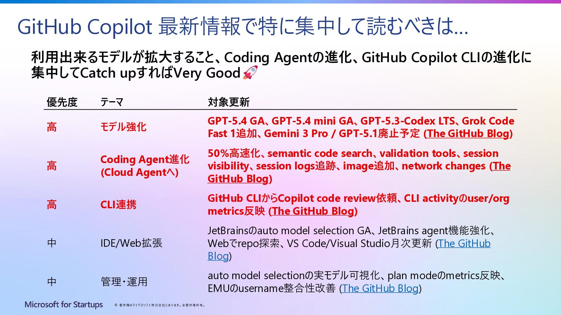 Copilot 最新情報で特に集中して読むべきは… 優先度 テーマ 対象更新 高 モデル強化 GPT-5.4 GA、GPT-5.4 mini GA、GPT-5.3-Codex LTS、Grok Code Fast 1追加、Gemini 3 Pro / GPT-5.1廃止予定 (The GitHub Blog) 高 Coding Agent進化 (Cloud Agentへ) 50%高速化、semantic code search、validation tools、session visibility、session logs追跡、image追加、network changes (The GitHub Blog) 高 CLI連携 GitHub CLIからCopilot code review依頼、CLI activityのuser/org metrics反映 (The GitHub Blog) 中 IDE/Web拡張 JetBrainsのauto model selection GA、JetBrains agent機能強化、 Webでrepo探索、VS Code/Visual Studio月次更新 (The GitHub Blog) 中 管理・運用 auto model selectionの実モデル可視化、plan modeのmetrics反映、 EMUのusername整合性改善 (The GitHub Blog) 利用出来るモデルが拡大すること、Coding Agentの進化、GitHub Copilot CLIの進化に 集中してCatch upすればVery Good