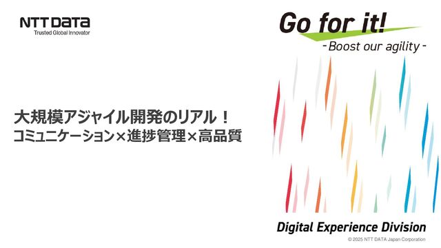 Framework)やLeSS(Large-Scale Scrum)などがあ るが、あくまでもフレームワークであるため、プロジェクト毎に異なる特徴を正確に捉えて、個々のプロジェクトに合わせたテーラリン グを行って、アジャイル開発を進めていくことが必要。 大規模プロジェクトをアジャイルで開発する場合に正解はないため、 自分たちで大規模アジャイルを作っていくことが必要。 なぜ大規模アジャイルなのか? 大規模プロジェクト 正解はない! or organization process development or or
